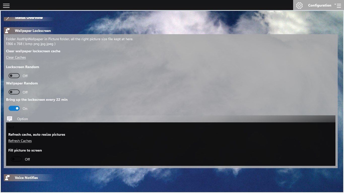 Lockscreen and Wallpaper, all the suitable picture size file put into the Pictures folder, sub-folder AsstHpWallpaper folder, and each individual lockscreen and wallpaper folders. User can enable and disable changing lockscreen and wallpaper while user interaction. User can clear the lockscreen and wallpaper caches to update the caches and auto resize the cached lockscreen and wallpaper pictures according to screen resolutions.