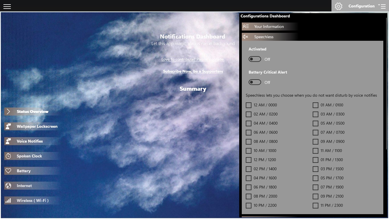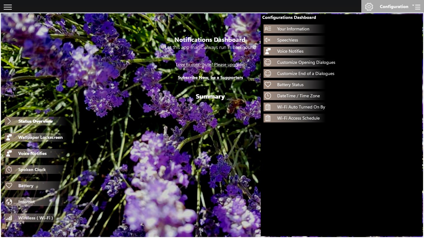 assistive technology with the Text-To-Speech technologywhen battery drops to lower limit and battery charging, voice notifies you about the battery status with estimating remaining time in minutetelling you present day of the week, datetime in local time, UTC time or 24 hour clock.watcher for Internet, voice notifies when offline and sound the morsecode alarm when online or offlinewatcher for wireless, auto turn off when not connected. auto turn on at specify durationwatcher for bluetooth, auto turn off the Bluetooth device when no device paired and sound the morse code alarmchange lockscreen and wallpaper updated on user activity lists of utilities, web browser customizes user agents, play popular audio video format file\'s using the device lockscreen like digital photo frameusing the device like a talking digital clock