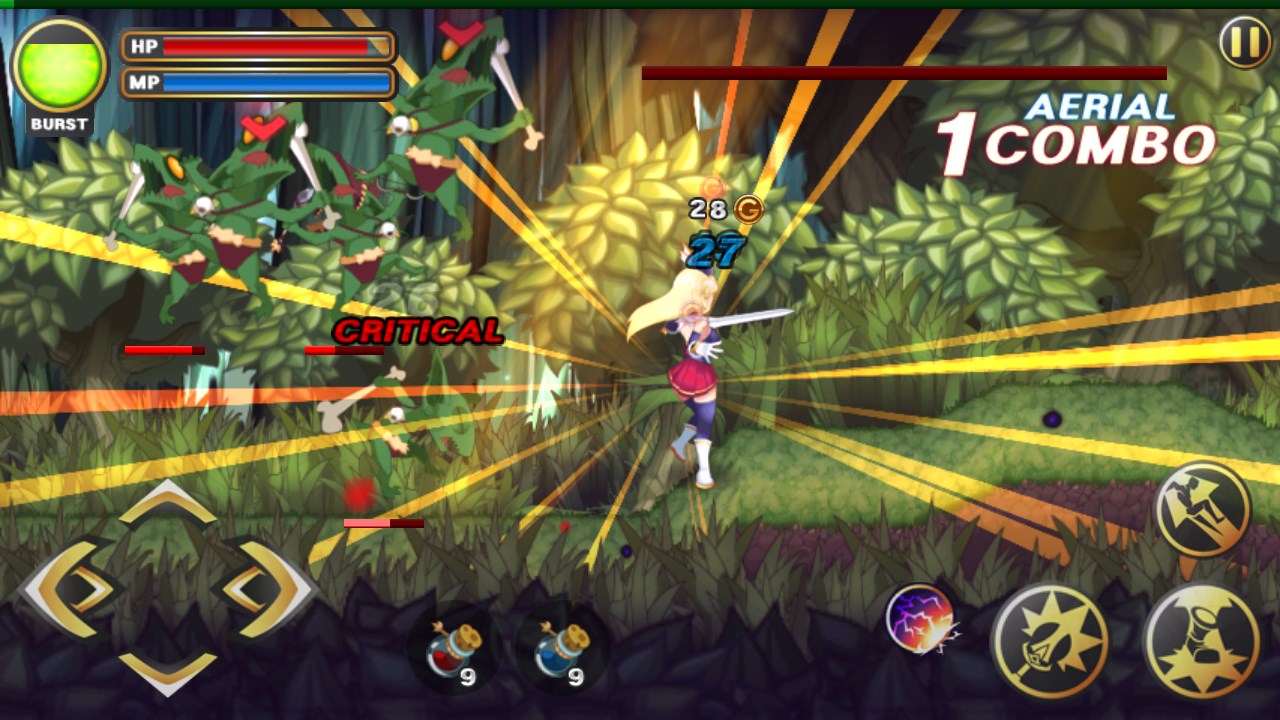 The skills are divided into active skills, basic actions and passive skills. For Elisa, the Thunder Attack, Spliting Slash, Flame Spear and Sword of Wind are used as active skills to attack enemies with different stances. Players are able to carry 3 skills at the start, which adds to 6 as the game goes. Elisa could also learn basic actions such as Backstab, Uppercut, Attack Addition, Thrust Kick and passives like Managing MP Potions and Managing HP Potions. The diversity of skills greatly increases the game playability.