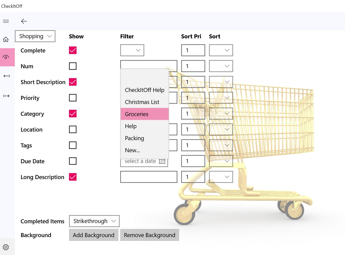 CheckItOff is a tool for managing items that you might put on a list – a shopping list, a todo list, a packing list, or anything like that. We don’t force you to use one particular kind of item, you just add items and fill in whatever fields you feel like filling in. The All Items view is what you see when you run the application, and it shows the Short Description of all the items you’ve added. Edit an item to see and edit other properties of it, like Category, Long Description, Due Date, or Priority. Use these in whatever way makes sense for you. You can combine things to buy, do, take, with people to invite, call, or buy presents for. You can create your own views that filter to just one category, to just completed or not-completed items, by tags, and so on. You can also import and export plain text files.
