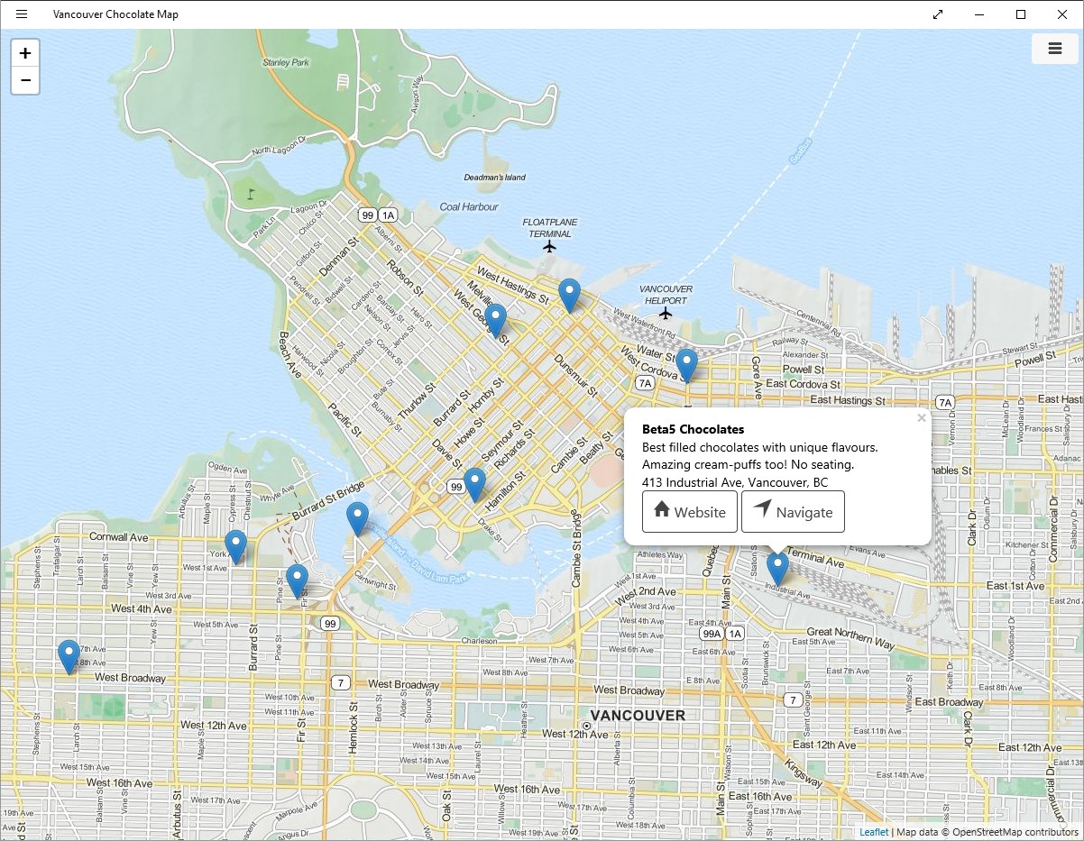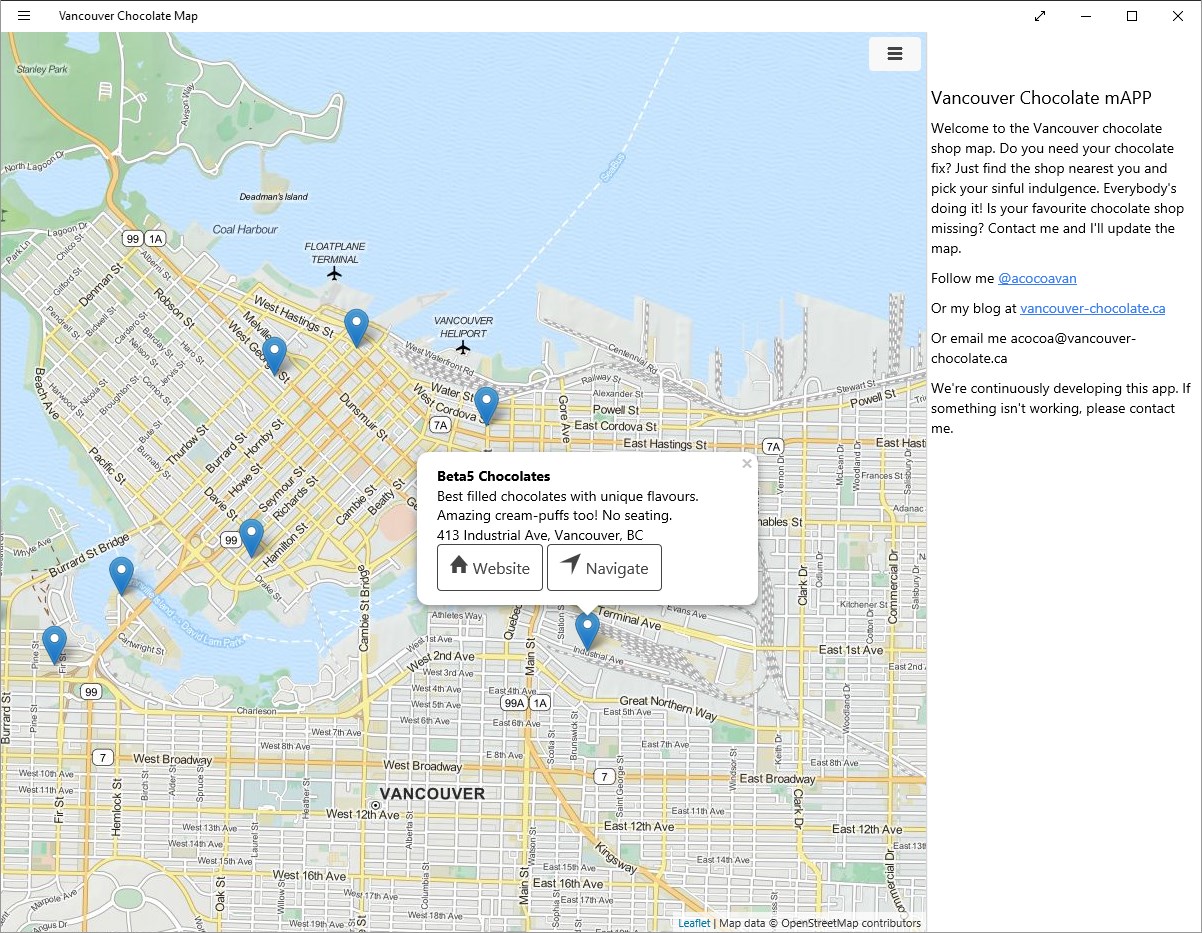 Works offlineMap of Vancouver with independent chocolate shopsShort comment on each shopLinks to websites and navigation for each shop