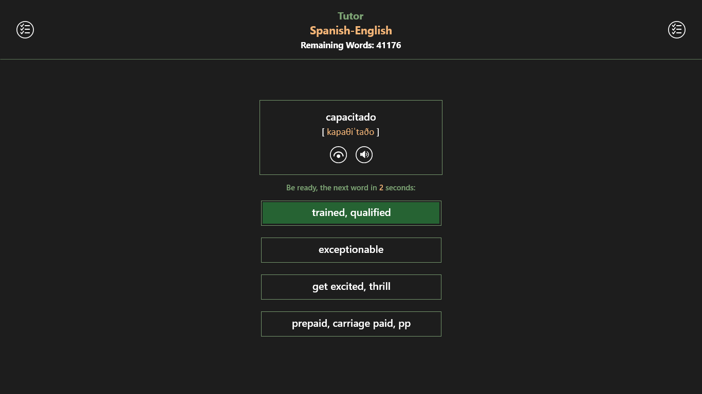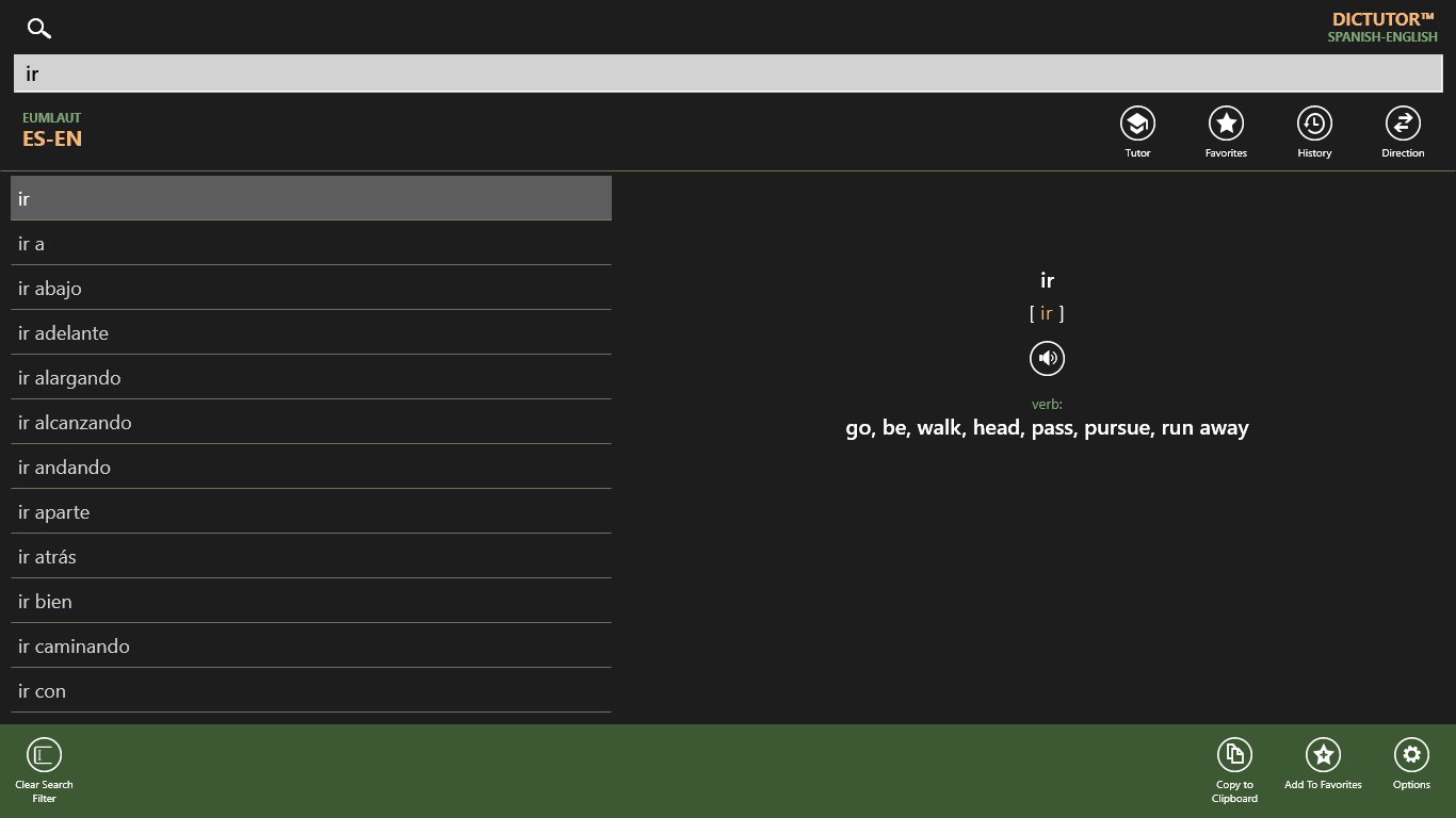 Dictutor ES-EN is an impressive bundle of universal offline Spanish-English and English-Spanish dictionaries with electronic tutor for English speaking users. It’s the powerful tool for mastering Spanish language. Dictutor lets you instantly translate and effectively learn new foreign words.