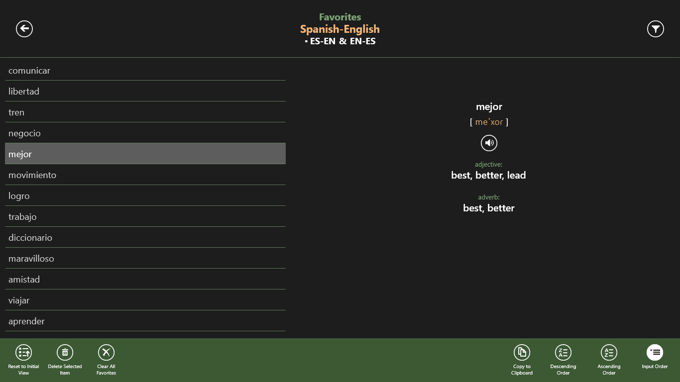 Translate words from Spanish into English and from English into Spanish.Fast switching between languages.Comfortable and fast search with predictive text input.Review the History of translated words, sort and group your Favorites list.Memorize words from the selected dictionary or your Favorites list by using electronic tutor.Listen to the pronunciation of words (Internet connection is required).