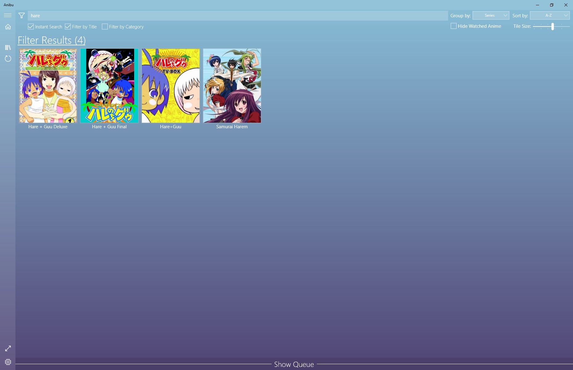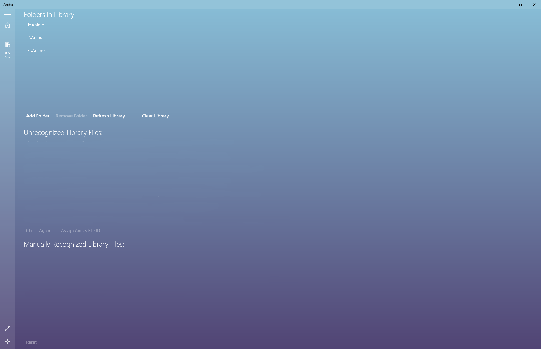 Library management is easy: just set the folders you want scanned and Anibu will recursively find all recognized media files and hash them. Once library folders have been cataloged, Anibu can incrementally recognize new files on-demand and add them to the library. Hashing can take a while depending on the file size, number of files, and storage speed so Anibu supports pausing and resuming library scanning operations; just close the application whenever you want and the next time you refresh the library, Anibu will automatically resume from where it left off.