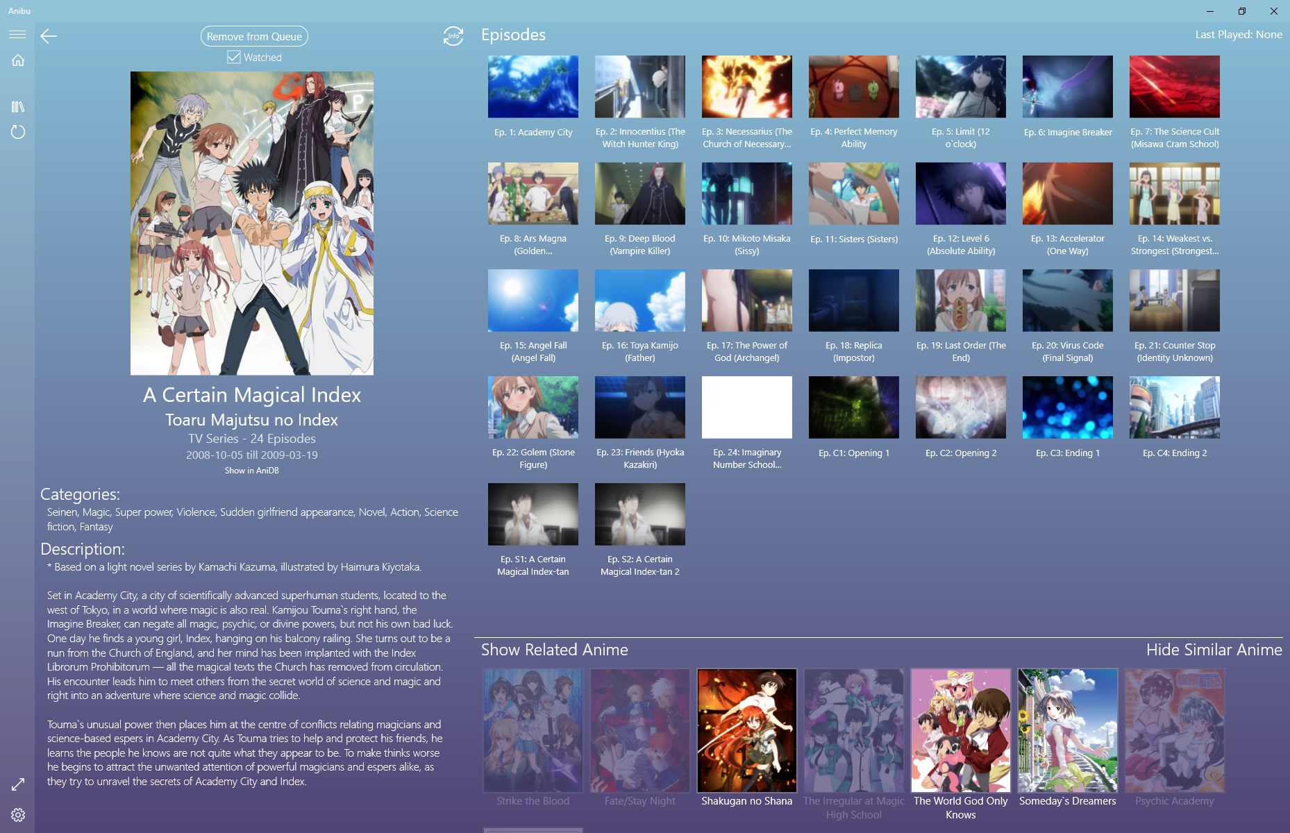Anibu is a media library browser designed to provide a Netflix-like experience for your local anime collection. Frustrated by filename-based scrapers like Kodi or Plex, Anibu was developed with hash-based scraping instead, meaning you no longer have to worry about organizing and naming files the "right" way to be recognized properly.