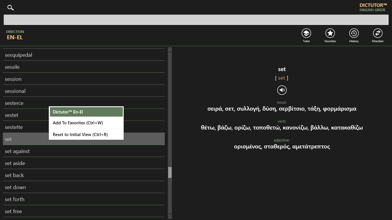 Dictutor EN-EL is an impressive bundle of universal offline English-Greek and Greek-English dictionaries with electronic tutor for Greek speaking users. It’s the powerful tool for mastering English language. Dictutor lets you instantly translate and effectively learn new foreign words.