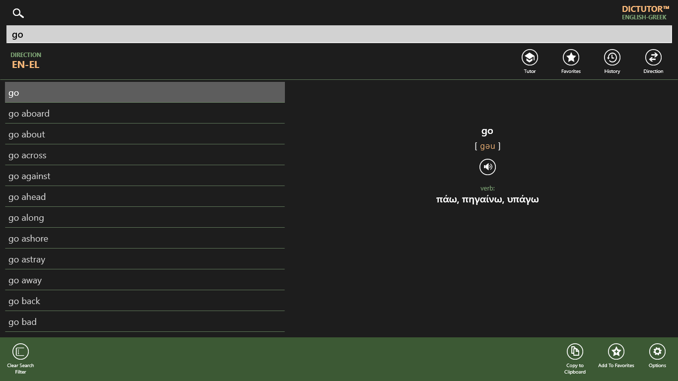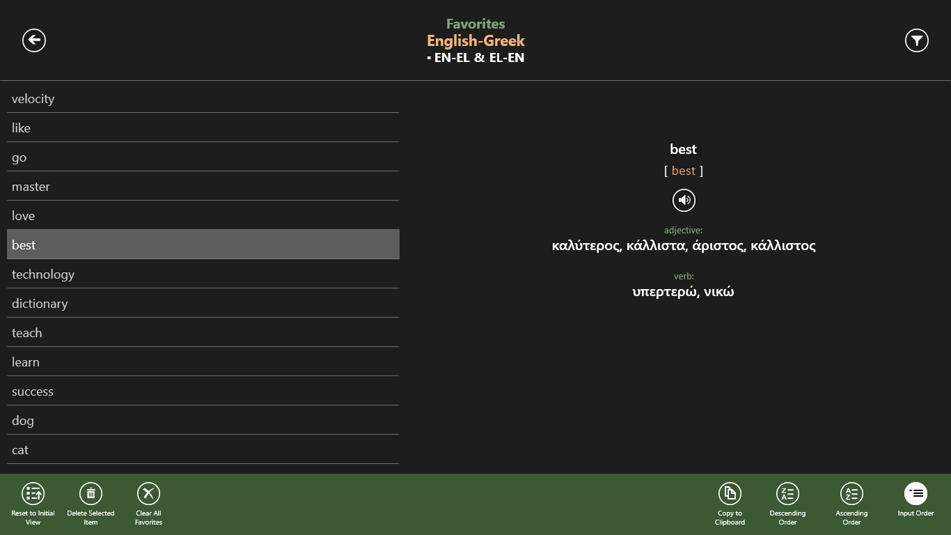 Translate words from English into Greek and from Greek into English.Fast switching between languages.Comfortable and fast search with predictive text input.Review the History of translated words, sort and group your Favorites list.Memorize words from the selected dictionary or your Favorites list by using electronic tutor.Listen to the pronunciation of words (Internet connection is required).