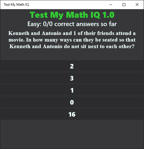 Test My Math IQ contains a few mathematical questions to test you calculation, combinatorics and logic skills. Check your math IQ with the program.