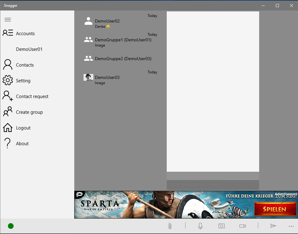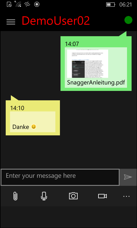 Snagger is a free Messenger app for Windows Universal Platform. Snagger uses the Internet connection ( 4G , 3G , 2G or Wi-Fi when available). You can send and receive messages , voice messages, video, photos and documents .