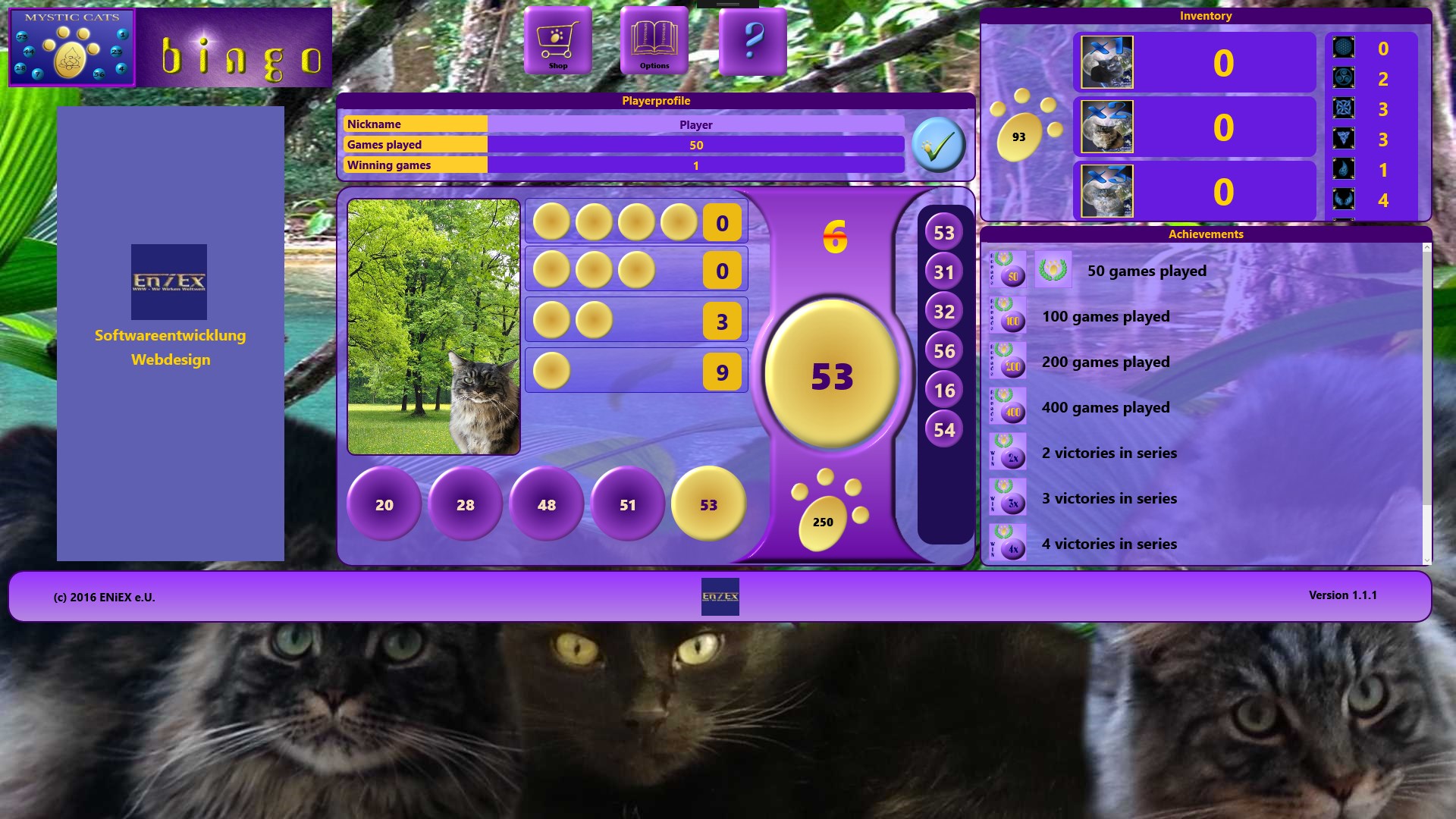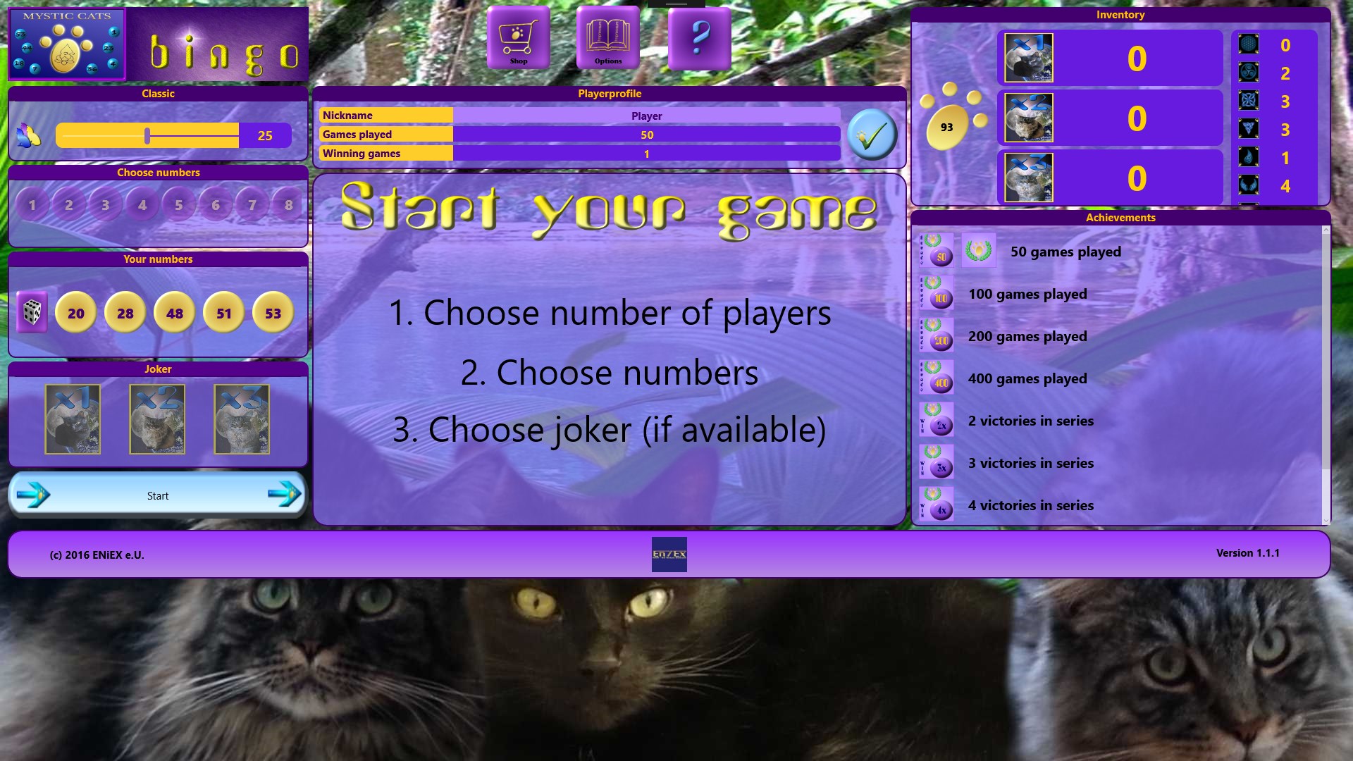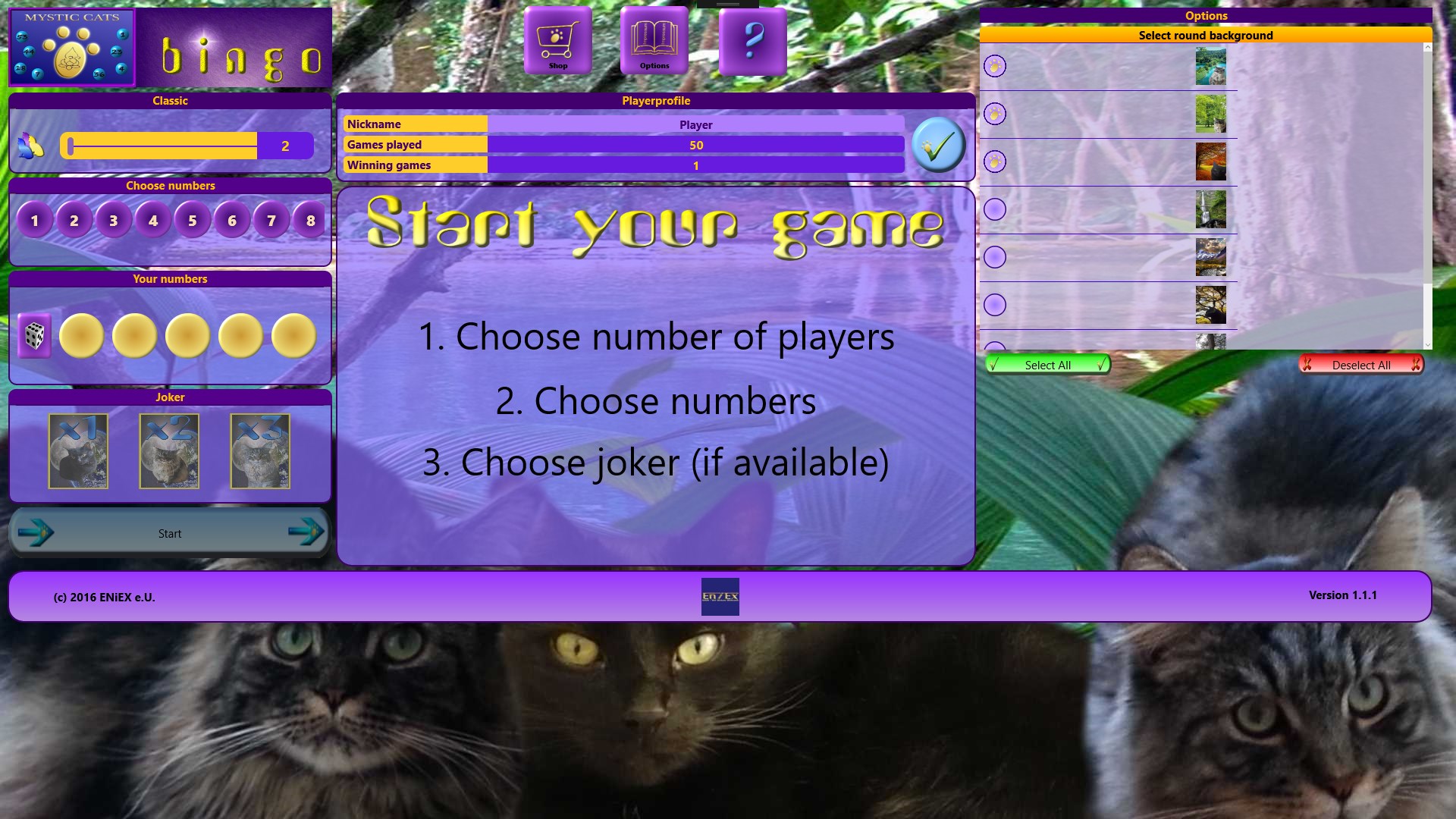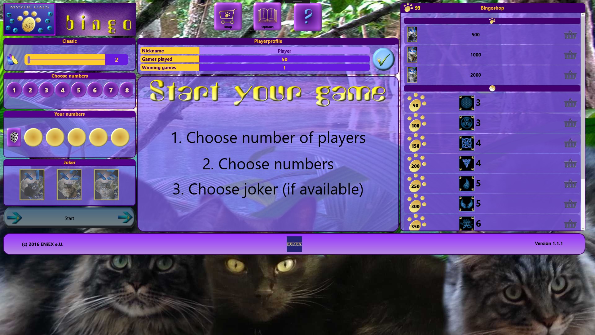 Just purr: The classic number Bingo, in a different way! Accompany the Mystic Cats: Spirit, Mystery and Lucky through the world of "Bingoballs". Choose 5 numbers and start at once! Use 3 different jokers, for more "paws". Swap these paws against goodies, to unlock even more gaming experiences. Receive achievements to obtain even more beautiful, new wallpapers! Discover together with the Mystic Cats, mysterious mystical symbols.