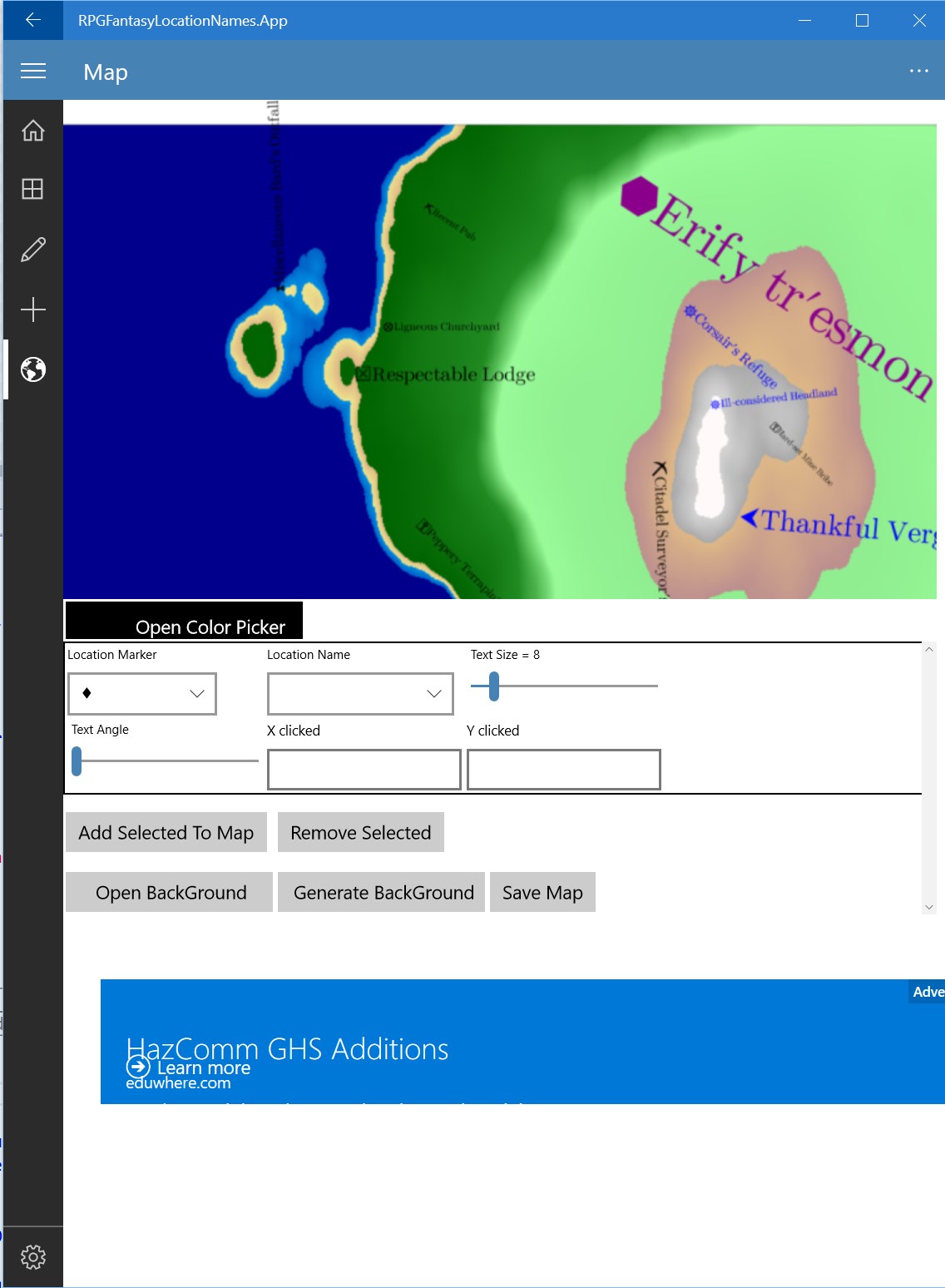 Simple fantasy topographical maps may be generated or loaded from external files and locations placed on them. The text size, color and angle as well as a place marker for each location is configurable. And maps are savable as image file.