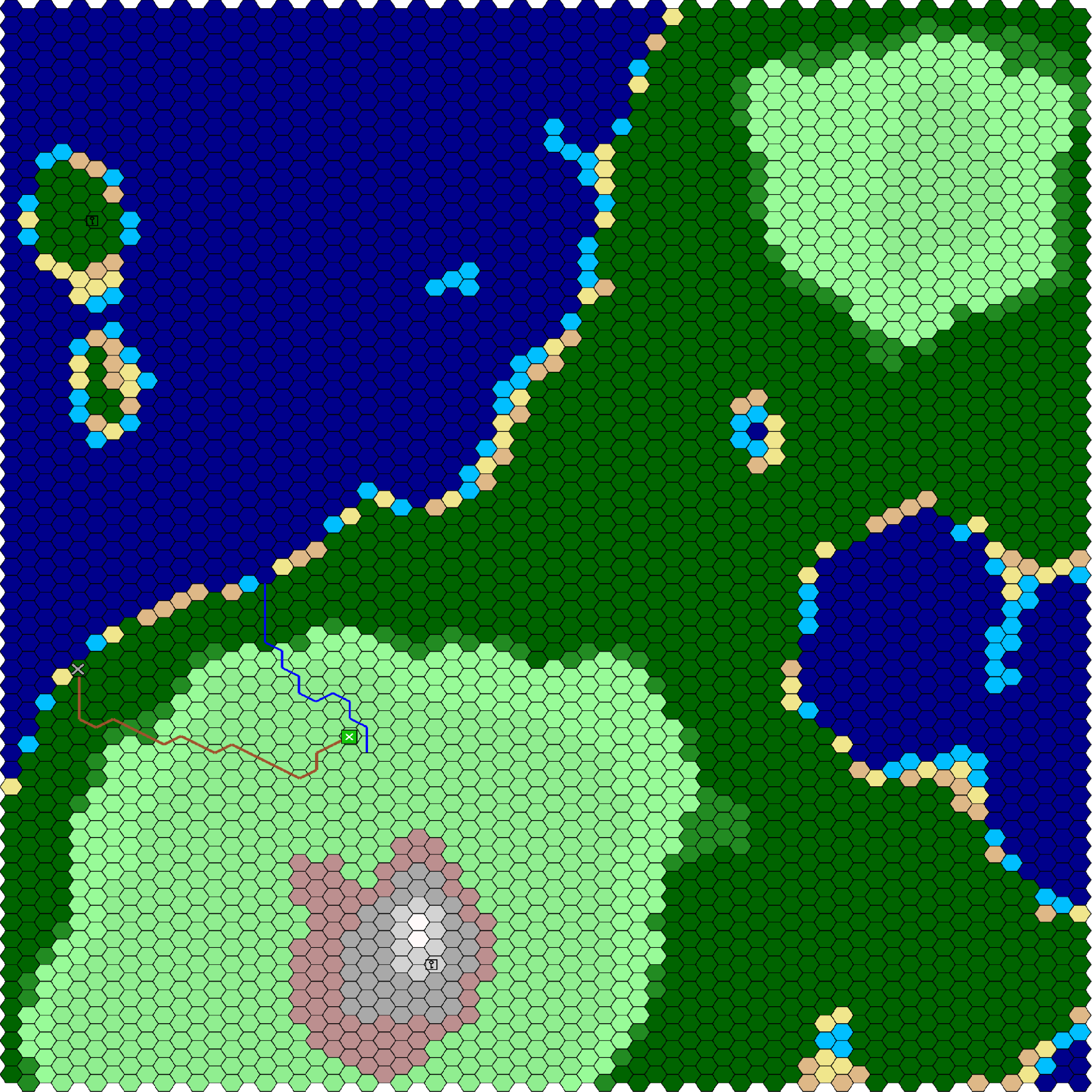 Hexagon maps in a 64x64 grid may be generated and edited. Roads, Rivers and Symbols may be added, Then the map may be exported to the page used for non-hexagon topographical maps to add text .