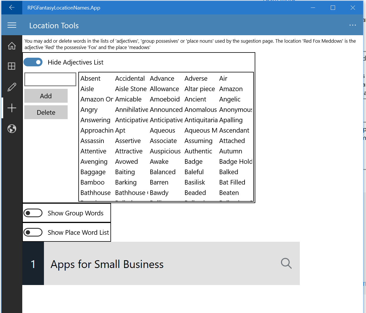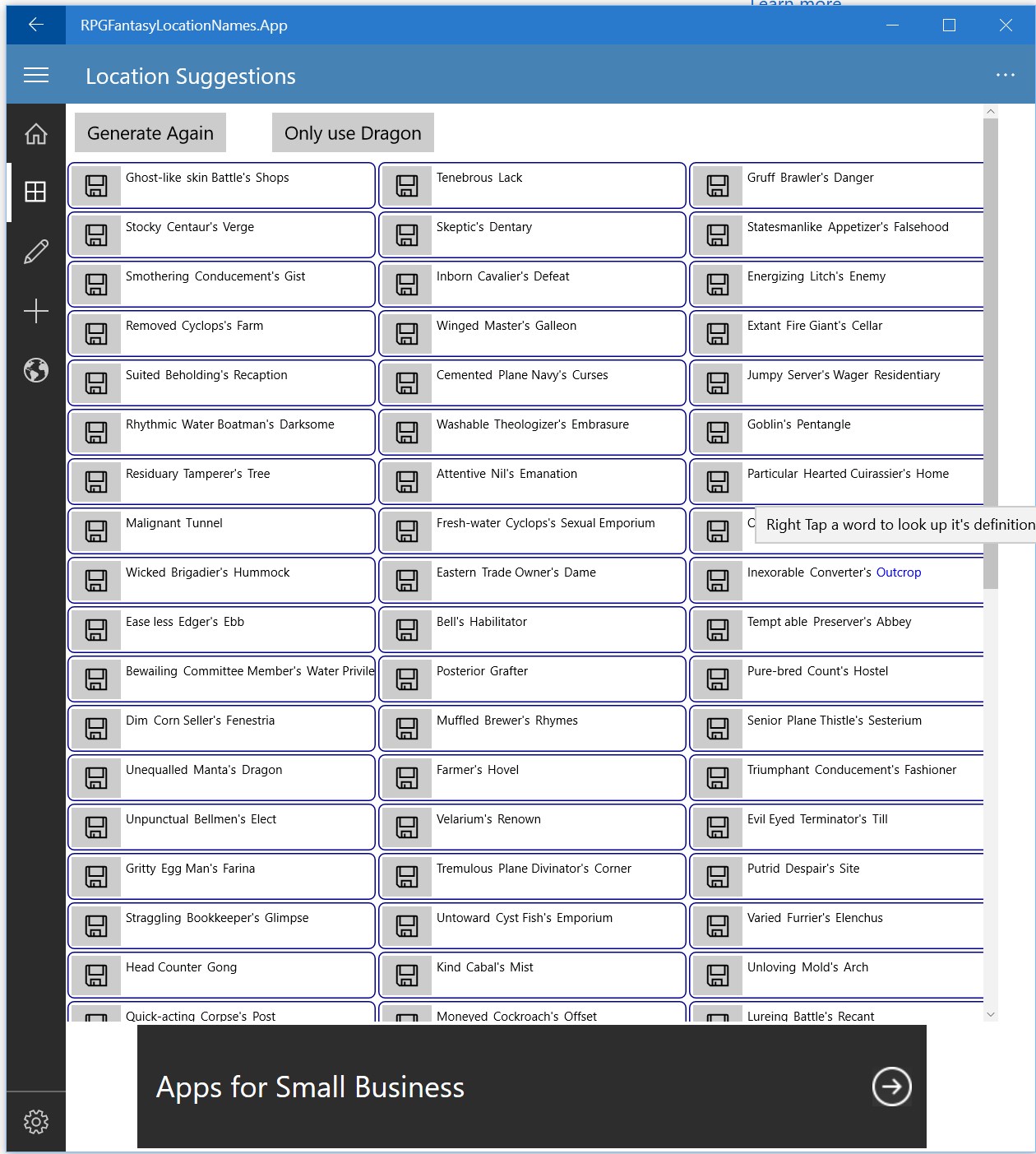 This program generates 2,940,000,000 possible location names. They are meant as suggestions, phrase combinations that trigger the imagination. There is a page of suggestions where names appear on buttons to be picked to edit or think about. As some words are obscure there is a tool to try to lookup the word definitions when needed.