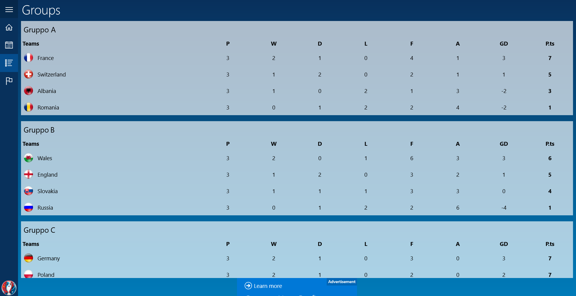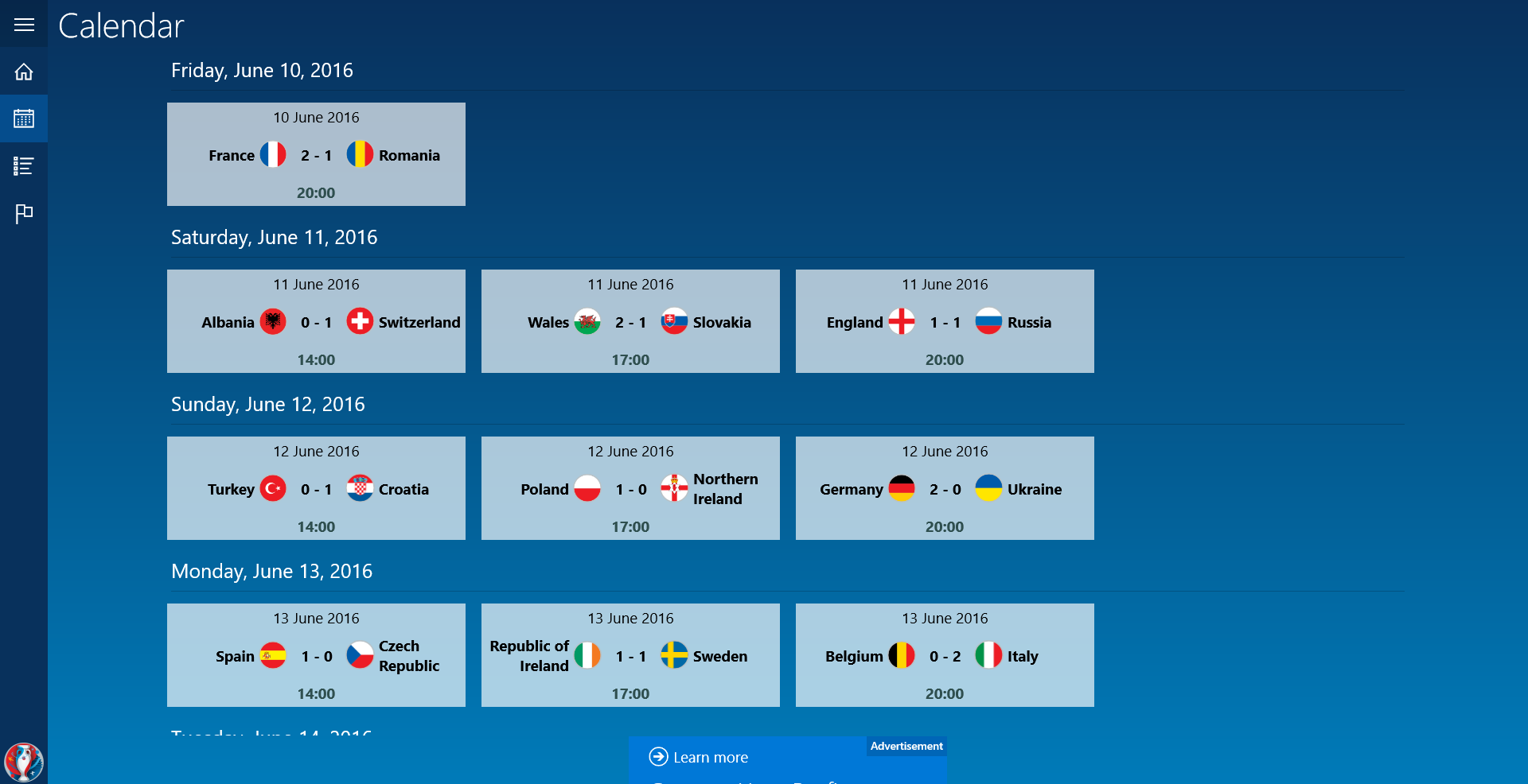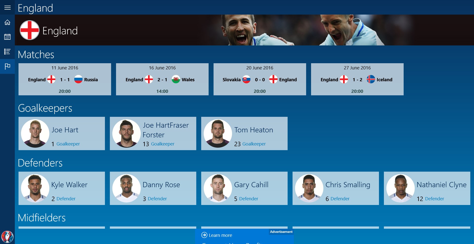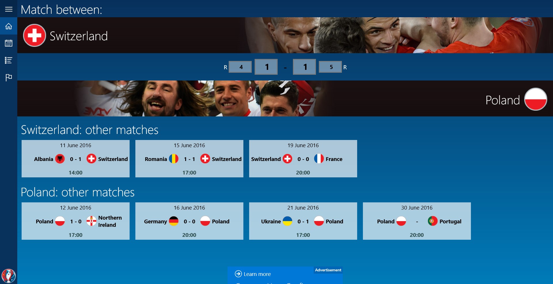 Have fun filling out the schedule for the final phase of the Europeans, regaining or insert by yourself the results of the finals. You'll have a database with all the information about the players (like age, weight, etc.), the teams and the calendar of the European Championship 2016.