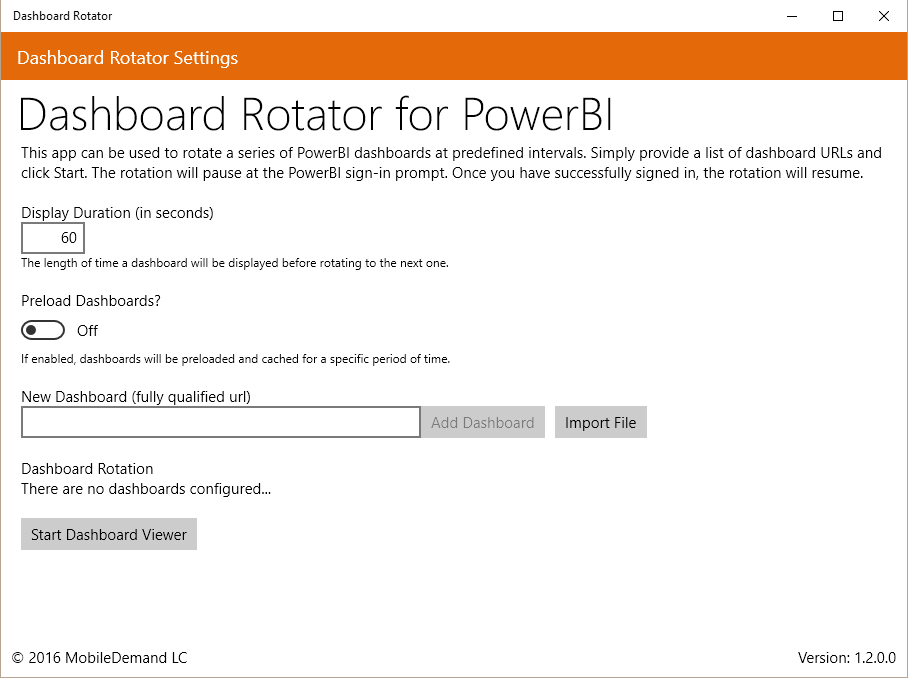 Dashboard Rotator is used to rotate a series of Power BI dashboards at configurable intervals. Simply provide a list of dashboard URLs, set the amount of time you want to display each dashboard, and click Start.