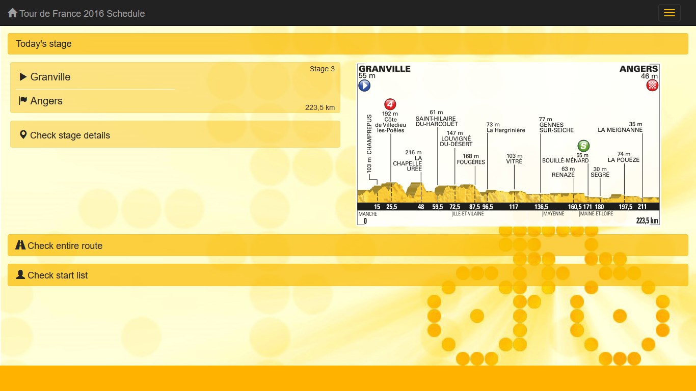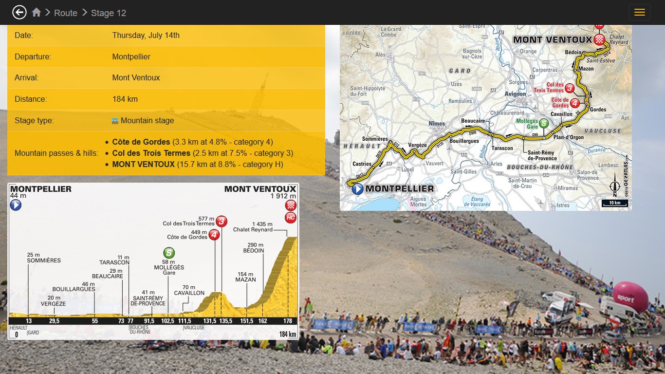Le Tour 2016 is a Tour de France application for Windows Phone and Windows PC. Provides you with profiles, maps and schedule of the entire Tour de France 2016.