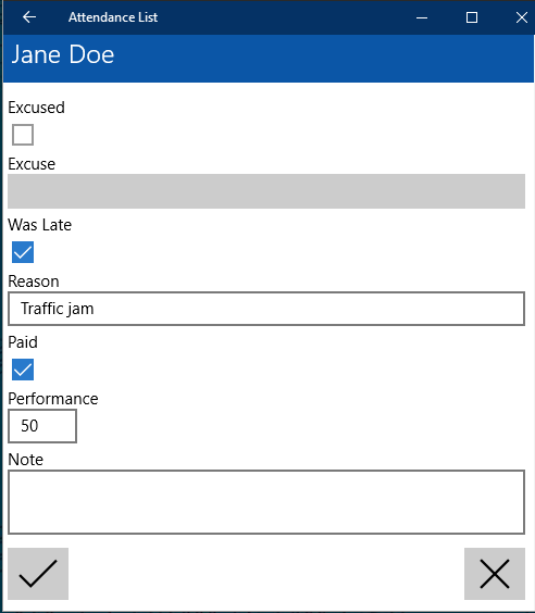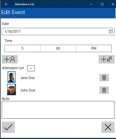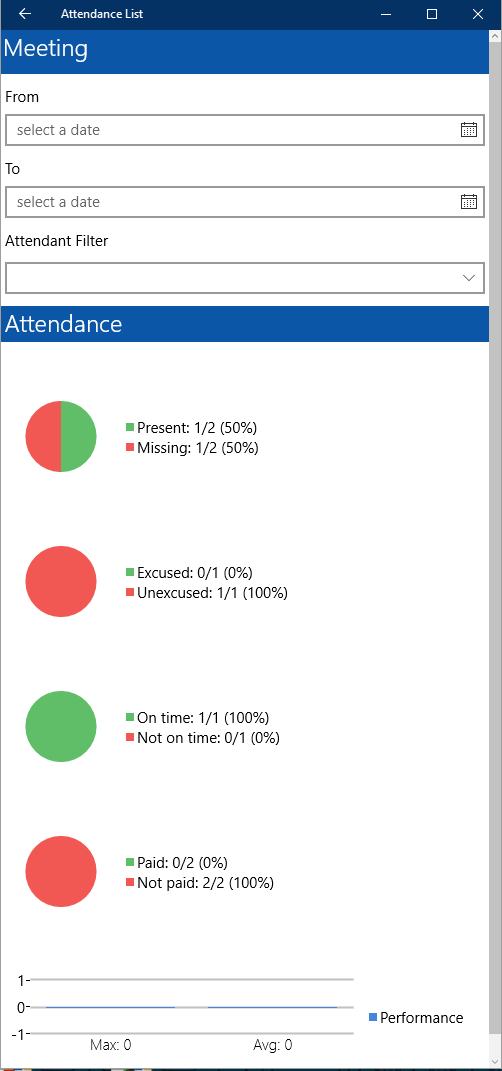 Attendant groupsCreate attendant core dataProfile picturesImport attendants from your contactsDifferent event typesCreate event core dataShare eventsReportsCalendar exportAutomatic backups configurable via OneDriveAutomatically repeating eventsLateness and excuses recordableRecord performances.csv ExportFeedback Hub