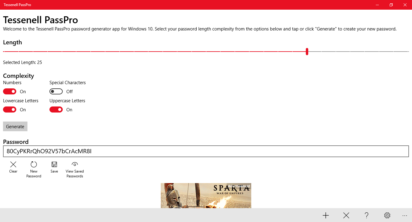 Need a new password? Tired of having to imagine your own every time a website makes you change yours? Try Tessenell PassPro! Easily generate new passwords with your own set complexities. Choose the length, and whether you want numbers, lowercase letters, uppercase letters or special characters, or a mix of all four. And you can save as many as you like to the in-app clipboard and come back to them later.