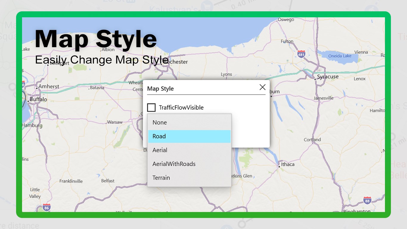 - Included with multi map style views like Aerial, Road, Terrain, etc.