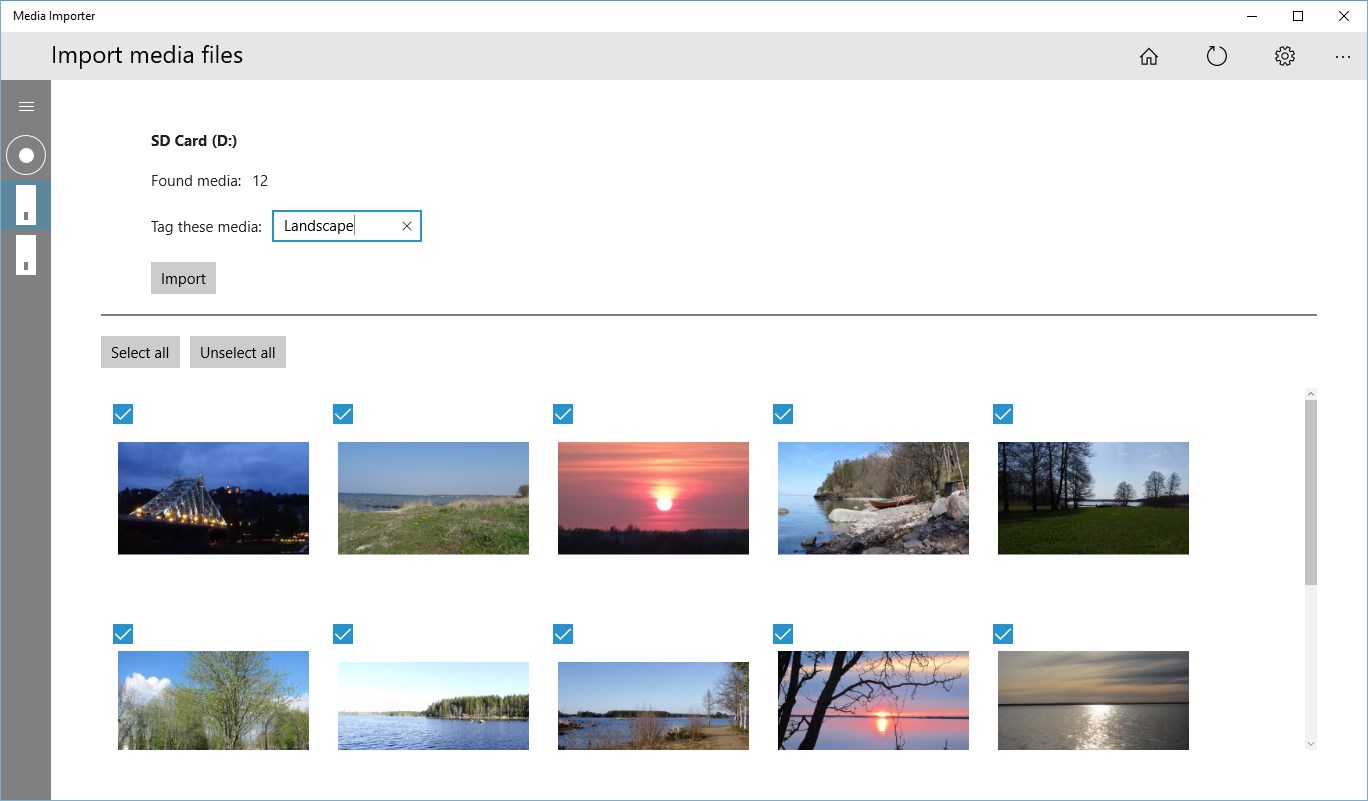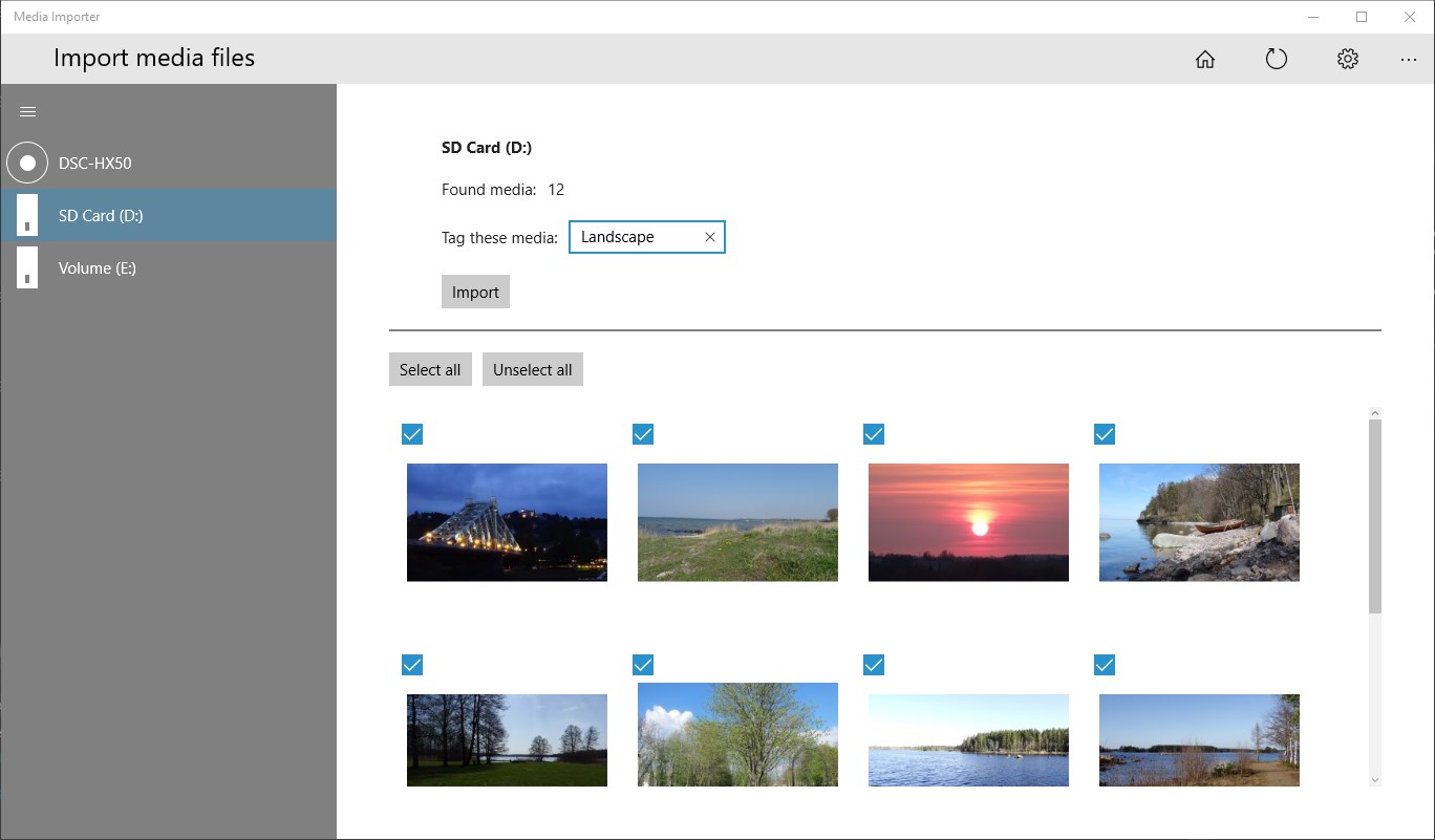 Import of images and videos from removable media and some camerasSupports AutoPlay: Automatic start when connecting a deviceOptional name for directories and filesConfigurable import directory and filenamesConfigurable deleting of pictures and videos after importOverview of connected cameras and removable mediaSupports cameras, USB sticks, SD cards