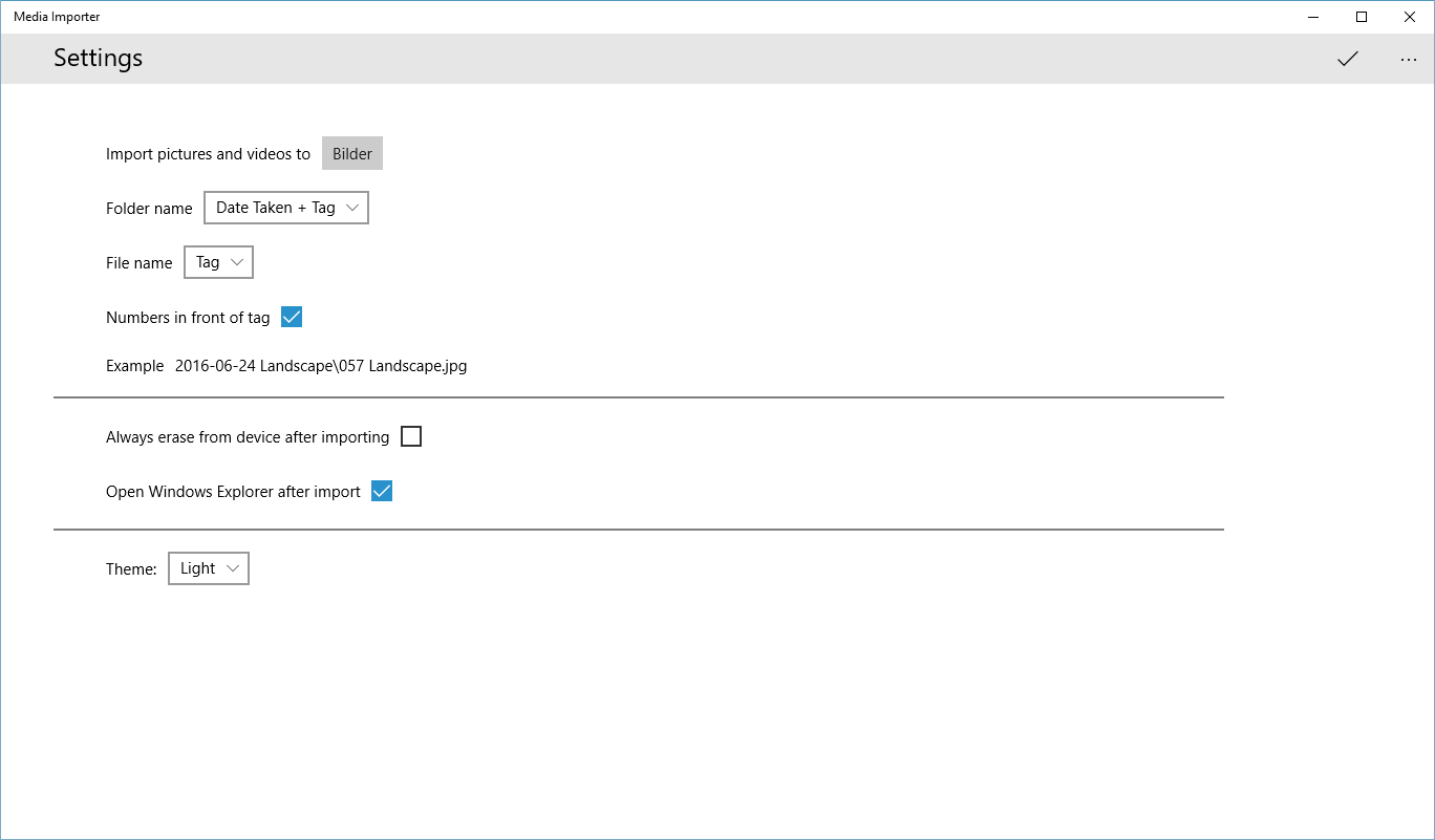 The professional Import of photos and videos from removable media to the computer with the Media Importer is a piece of cake. It supports importing from devices such as some digital cameras, USB sticks and SD cards. Media Importer supports you through settings like the naming of the files and folders to facilitate the storage and organization of your media on your computer.