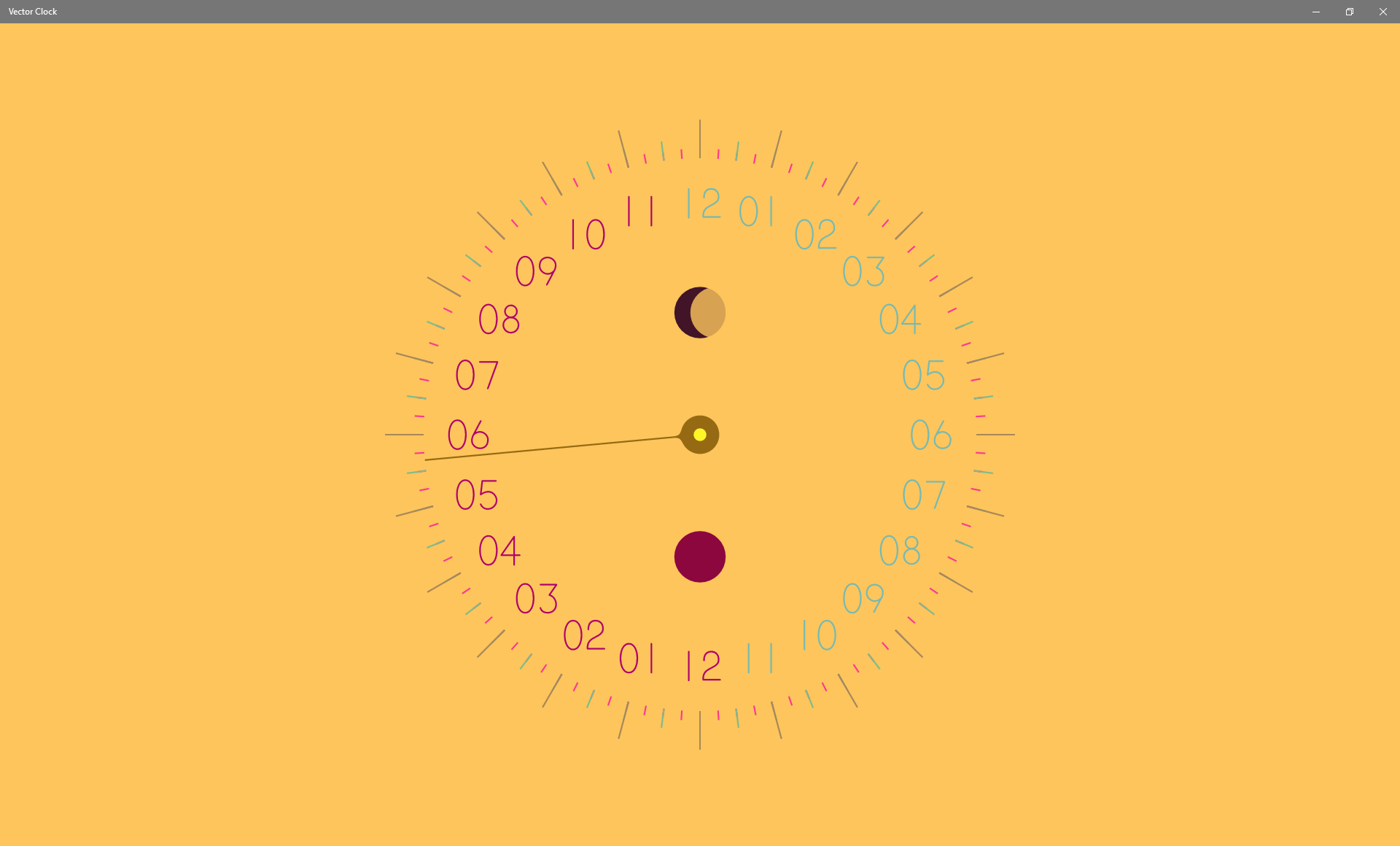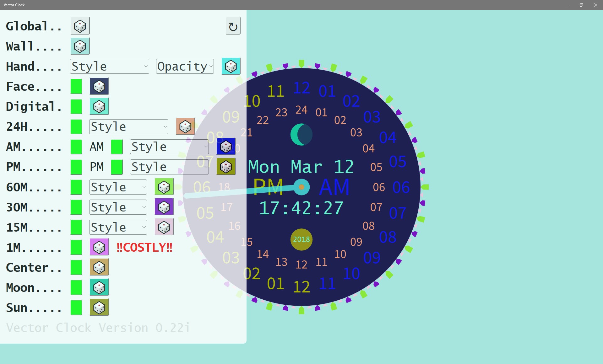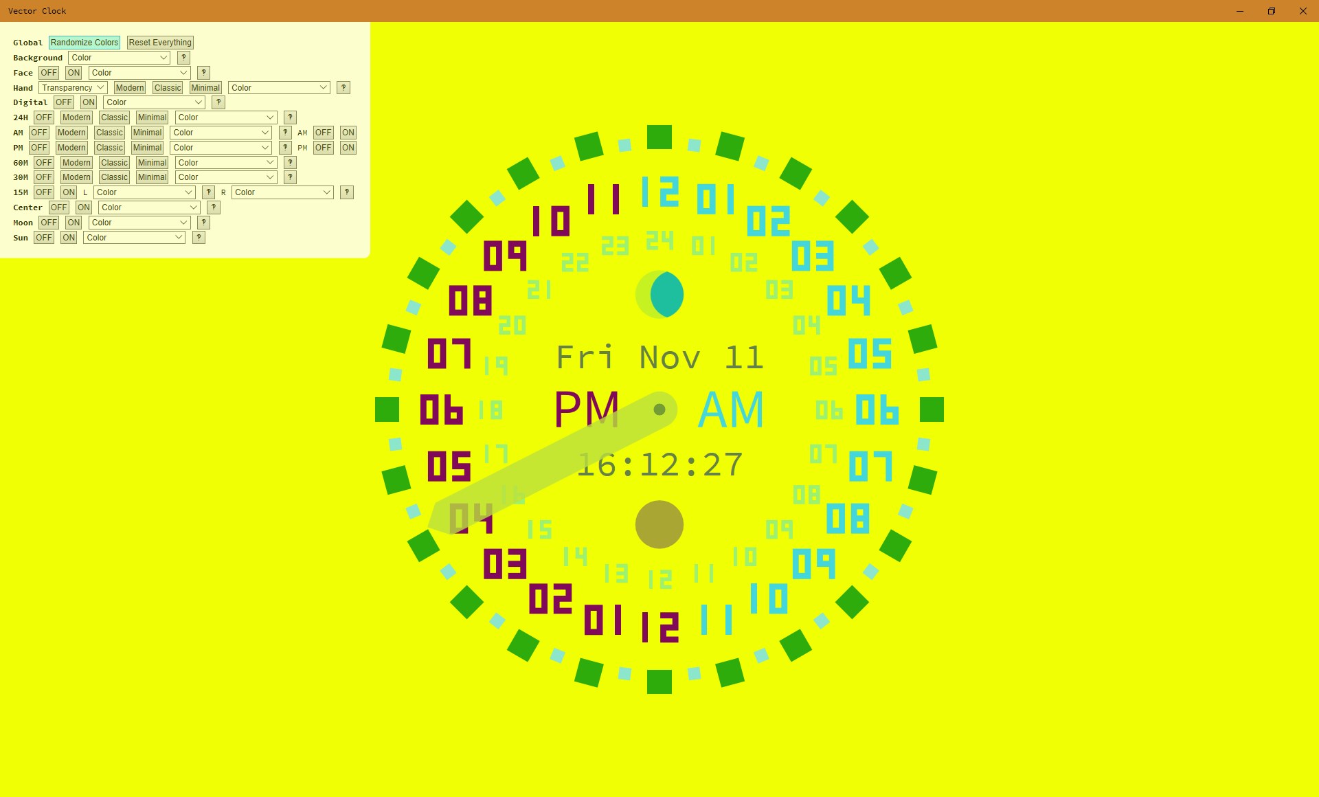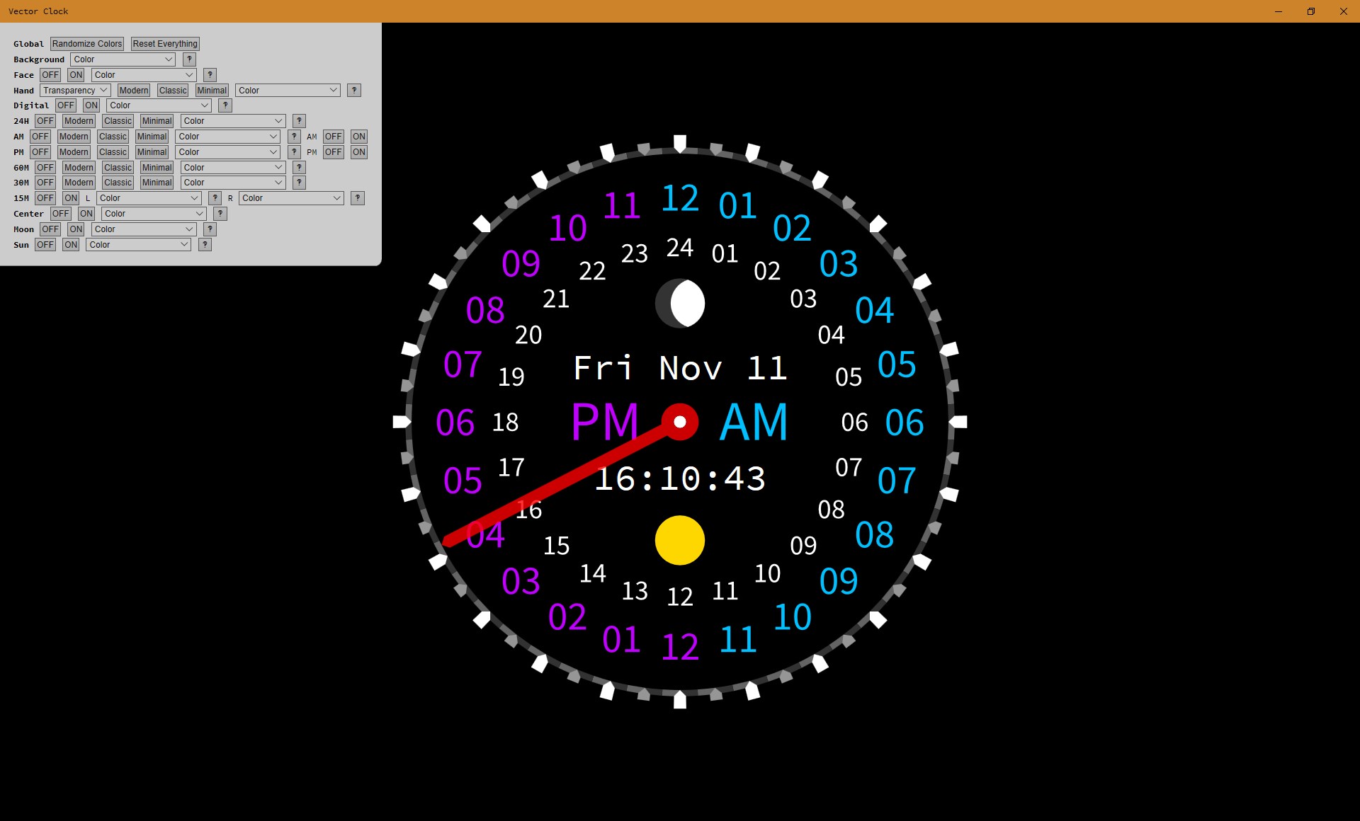 Visually Vector Clock uses the more uncommon and functional 24 hour (vs. 12 hour) analog clock face to improve legibility and allow for rapid conceptual reading of the passage of time. Meaning that the hour hand makes 1 revolution every 24 hours.