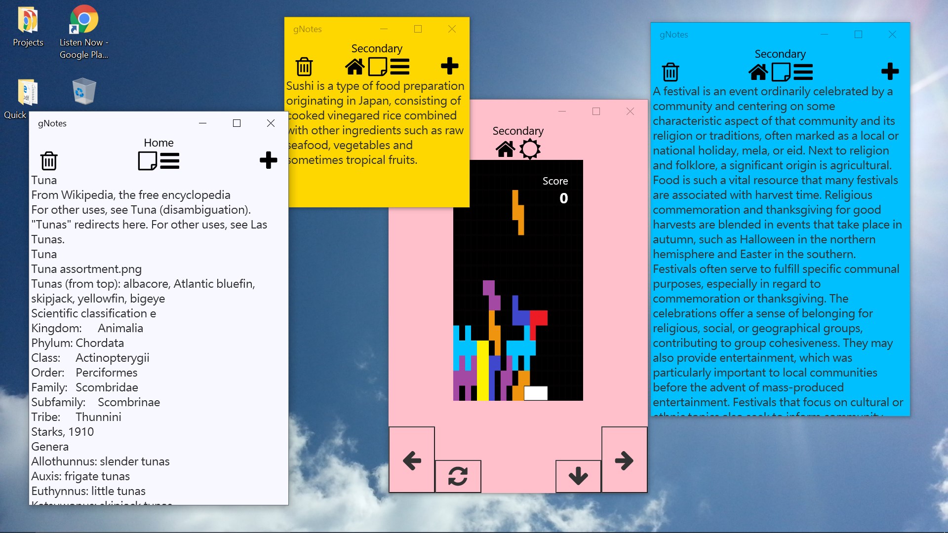 gNotes is a fun way to keep notes; quickly switch between your note and a quick game. Inspired by long and boring meetings--the game is used as a quick refresher. gNotes supports multiple views and snap; can be used on desktop or mobile devices. gNotes quickly autosaves your notes; gNotes also can import and export notes. The game automatically pauses when you switch back to your note or when you focus on another widow.