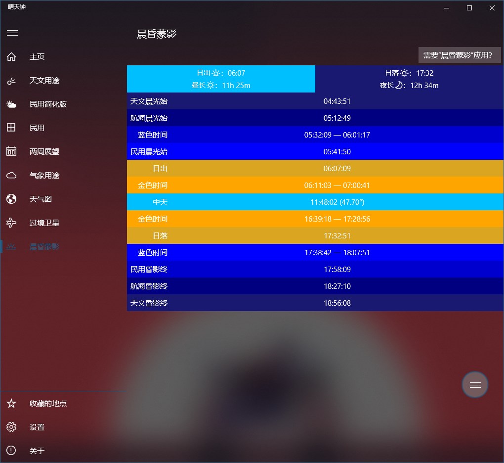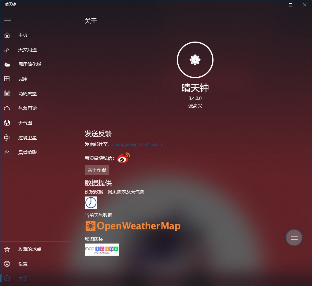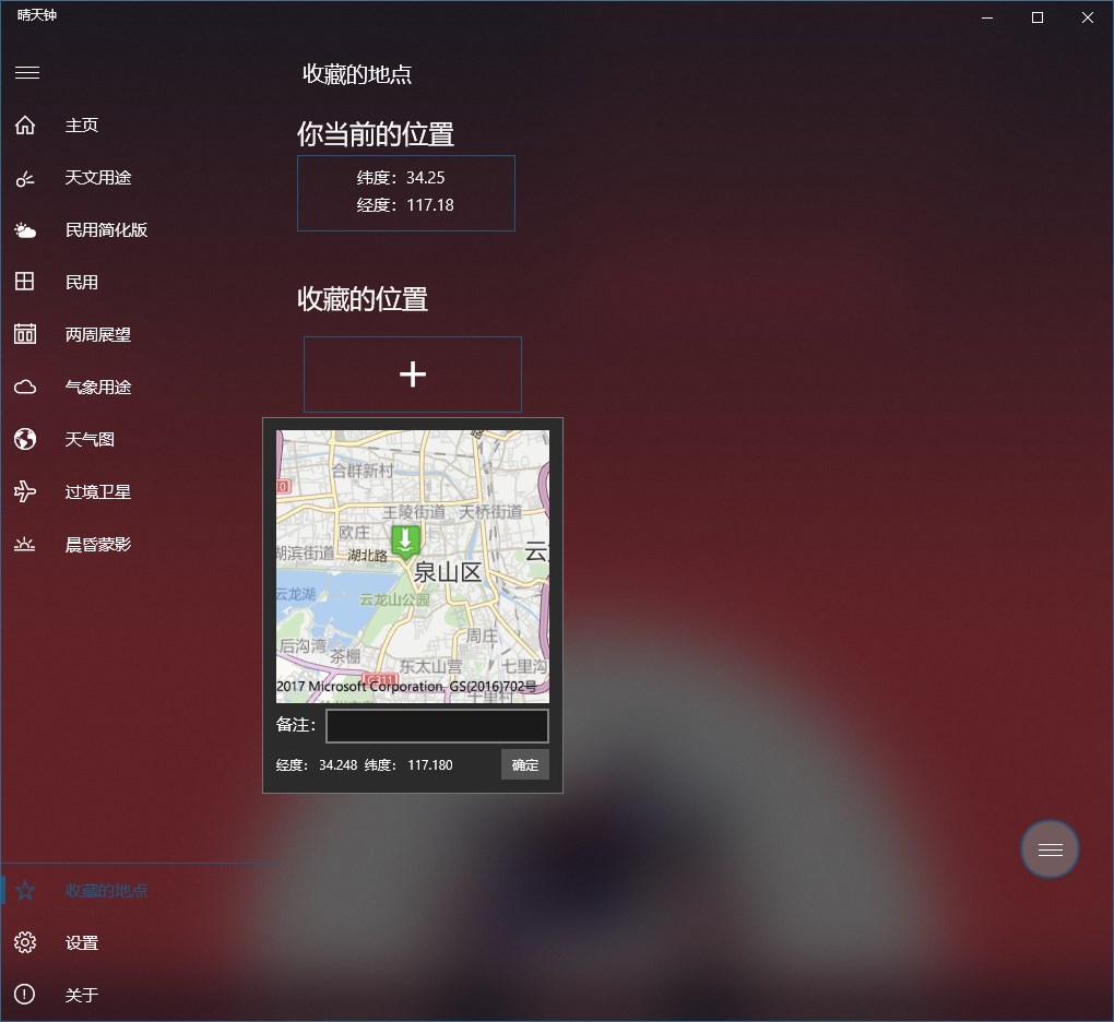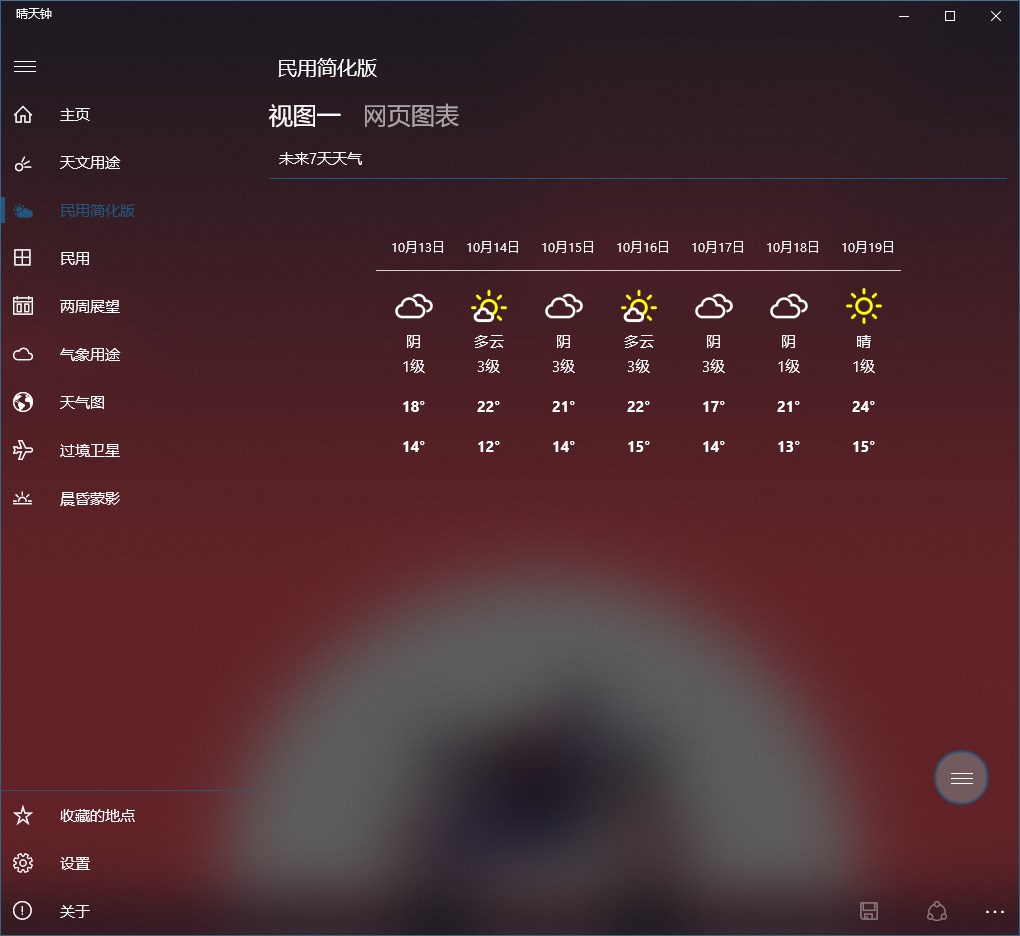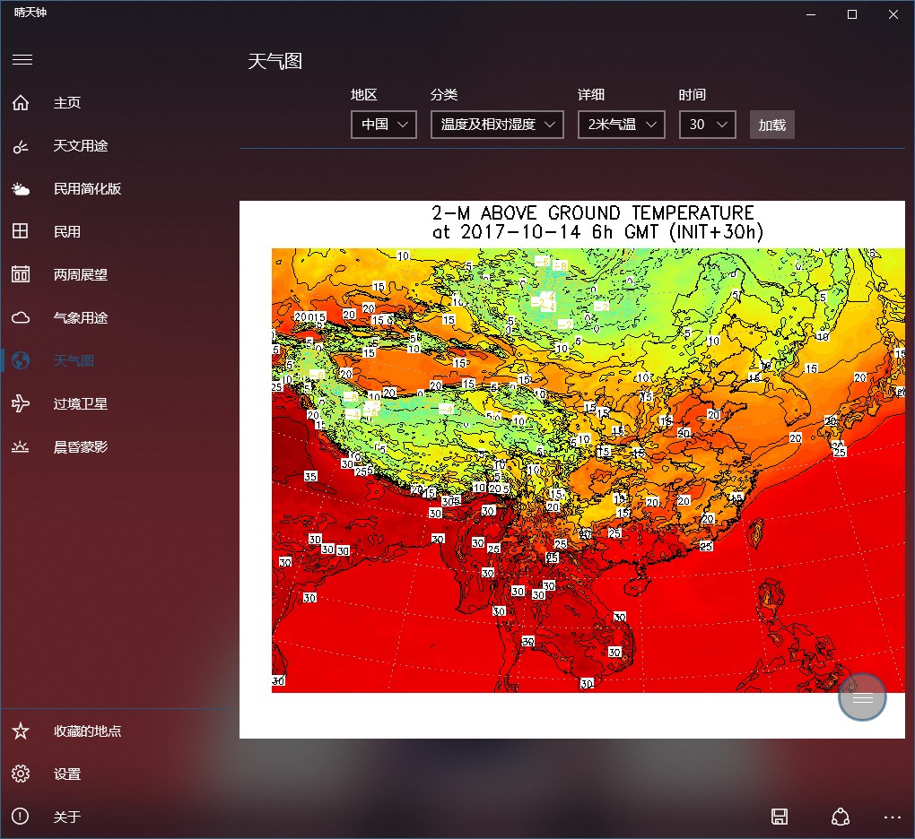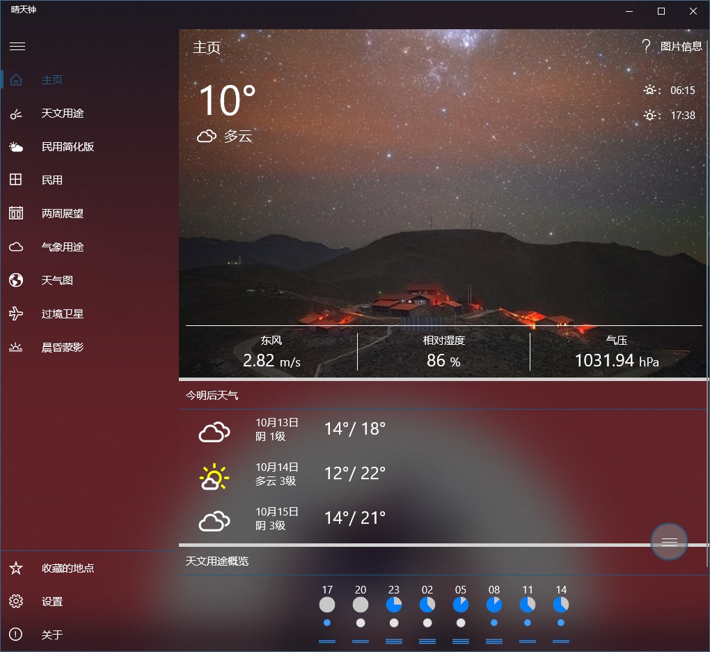 提供天文气象预报,如视宁度、大气透明度等提供当前天气预报提供详细的气象数据以及长达两周的气象预报支持必应地图选点提供了详细的天气图与简略的卫星过境信息查询支持磁贴可添加地点收藏