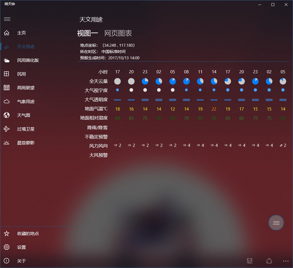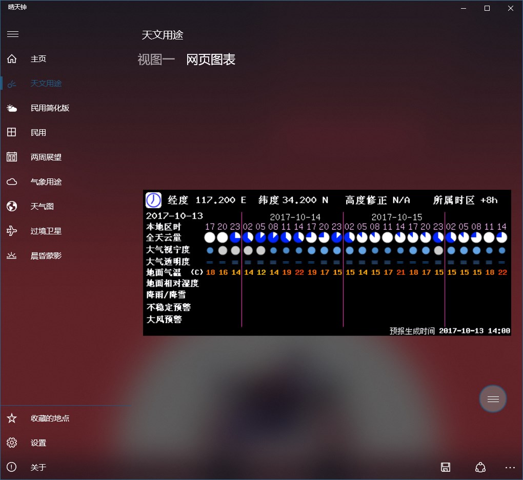 晴天钟是一系列天气预测产品的总称,可提供如云量、大气透明度等详细的气象信息,每日更新4次数据。