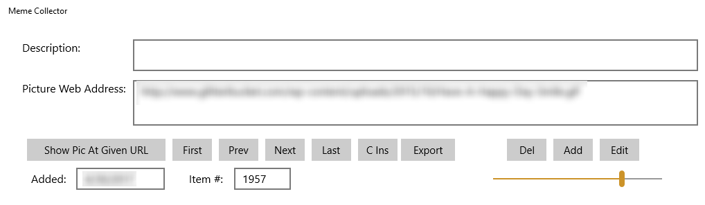 Keep a list of memes and their Internet location.Ability to keep track of date added.Ability to quickly move through your collected memes through a list forward and back by button or keyboard left and right arrow keys.