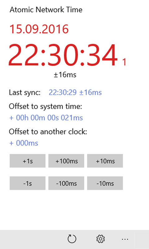 Atomic NTP Time precise implementationPackage Roundtrip TimeAdjustable in fine steps to another watch to determine the exact time differenceUser specified timeserversWindows 10 Universal App for Desktop, Smartphone and Tablet.