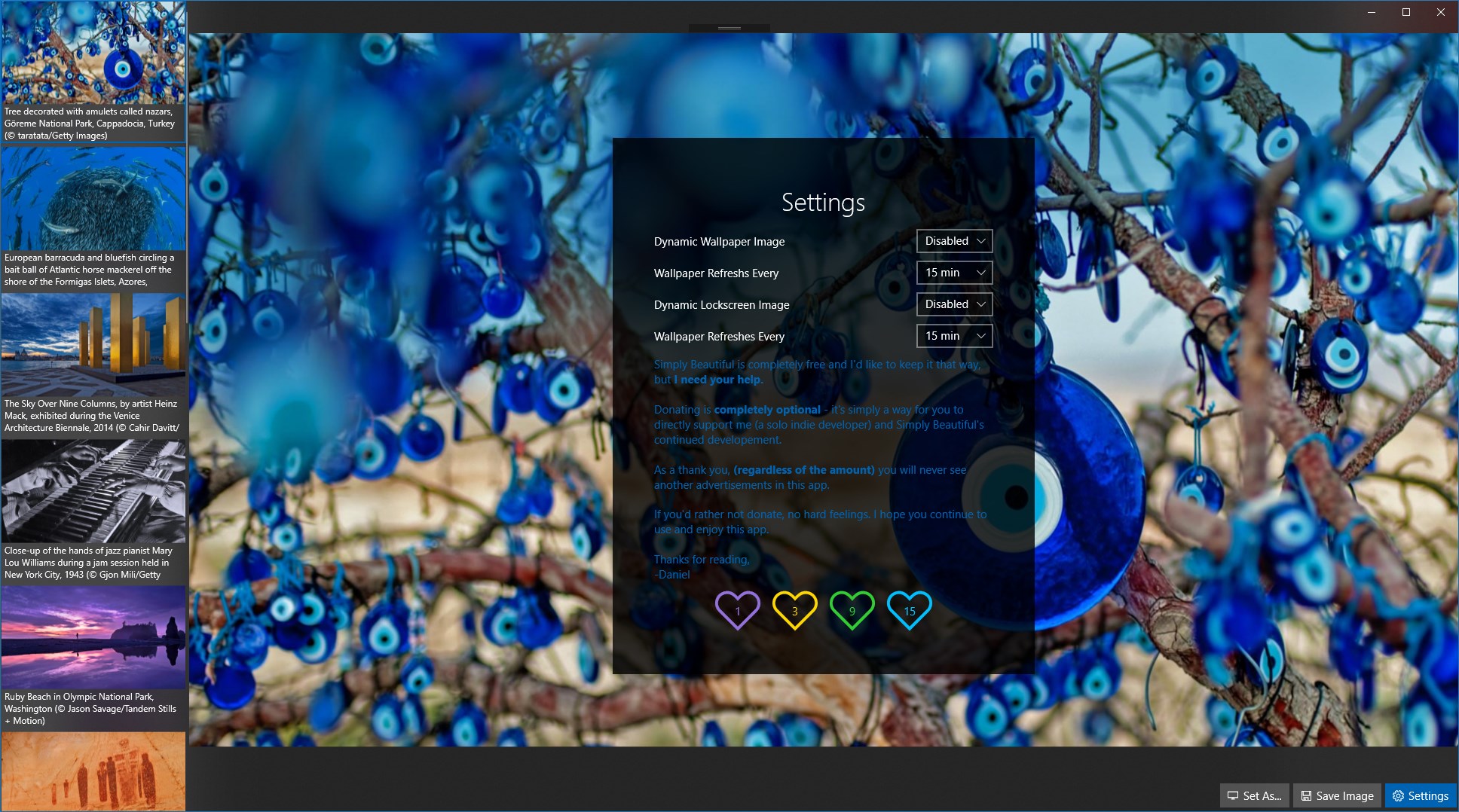Dynamic Wallpaper or Lockscreen of Bing's Image of the day. Additional option to randomly change your wallpaper in the background up to every 15mins.