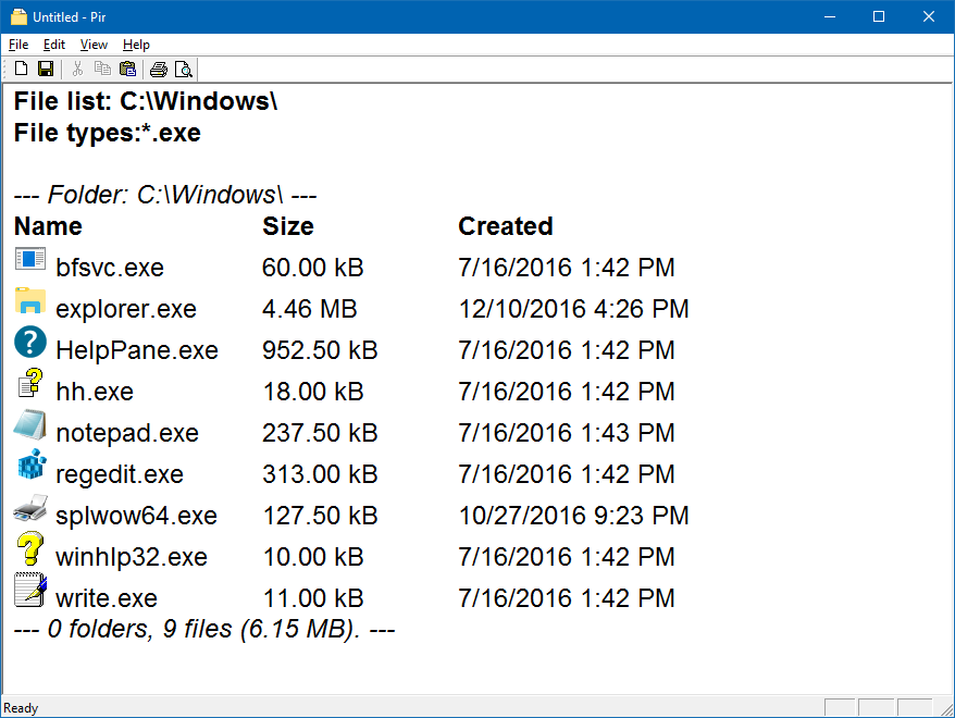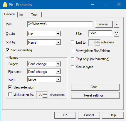 Pir is a classical application for creating file lists. Create lists with icons, file details, MD5- and SHA256 checksum, size on folders and lot more. Pir is fast and simple to use.