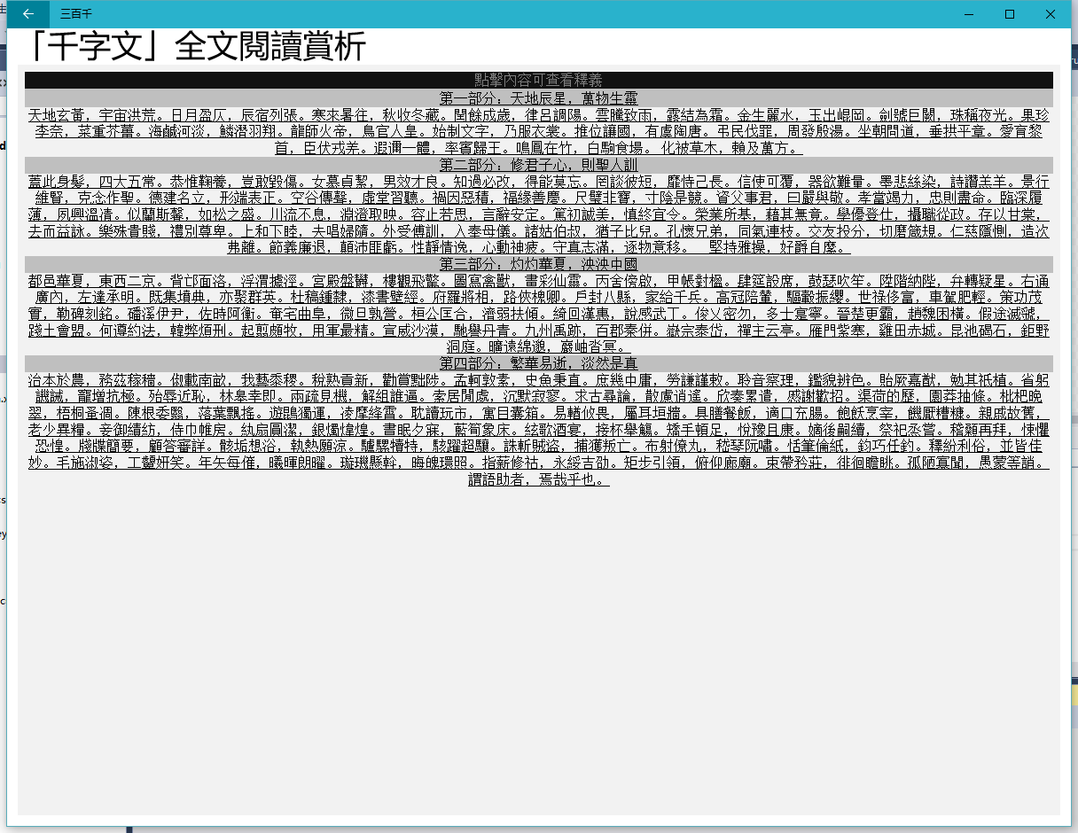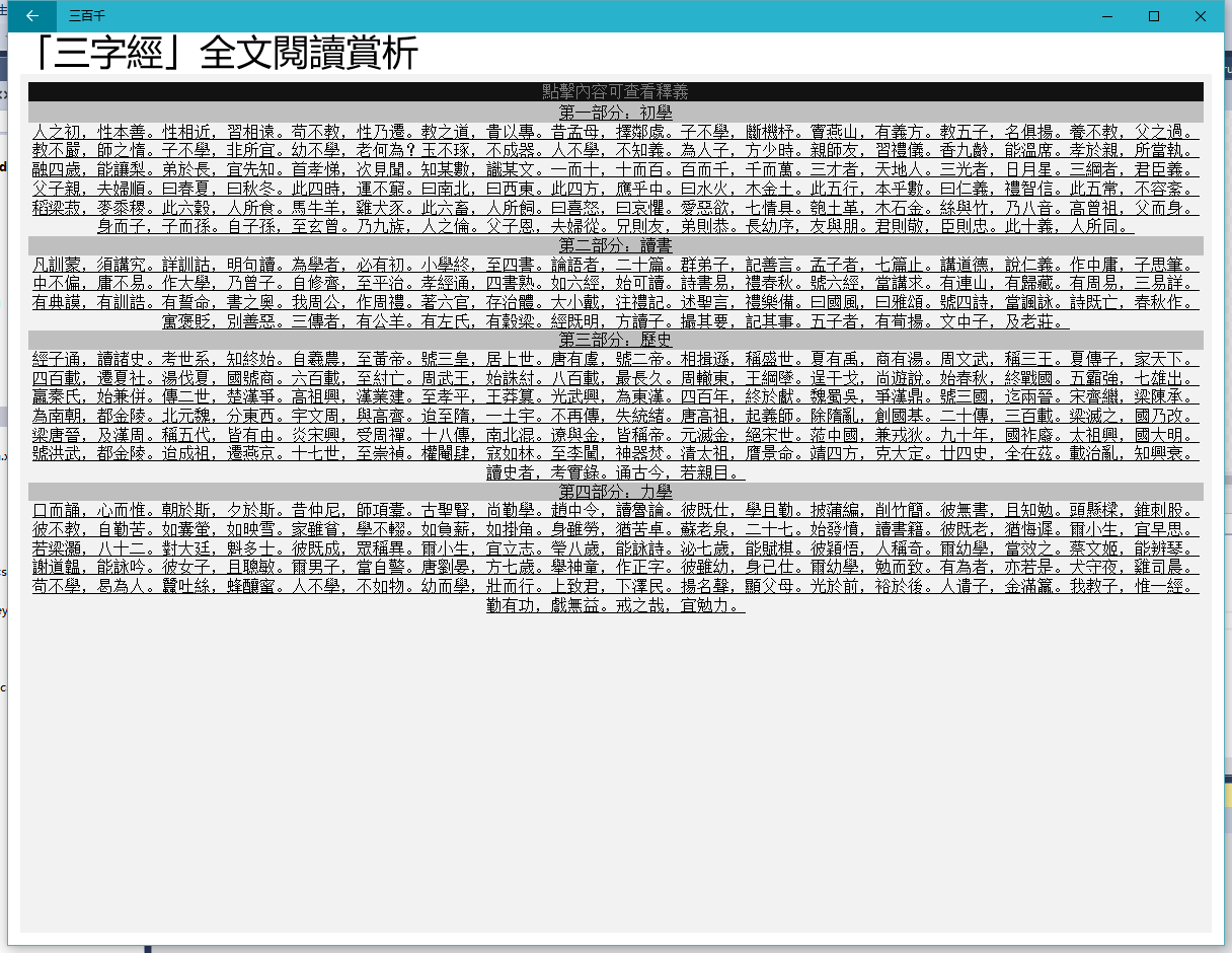 集三字經、百家姓、千字文於一體。三字經採用劉宏毅博士的「三字經講記」,千字文採用劉宏毅博士的「千字文講記」。千字文內置田蘊章的楷書書法。