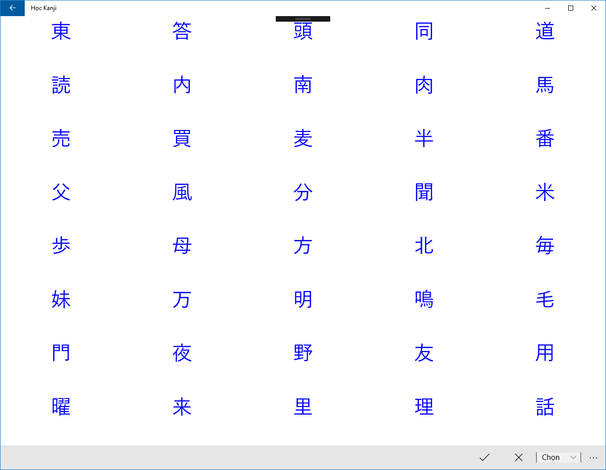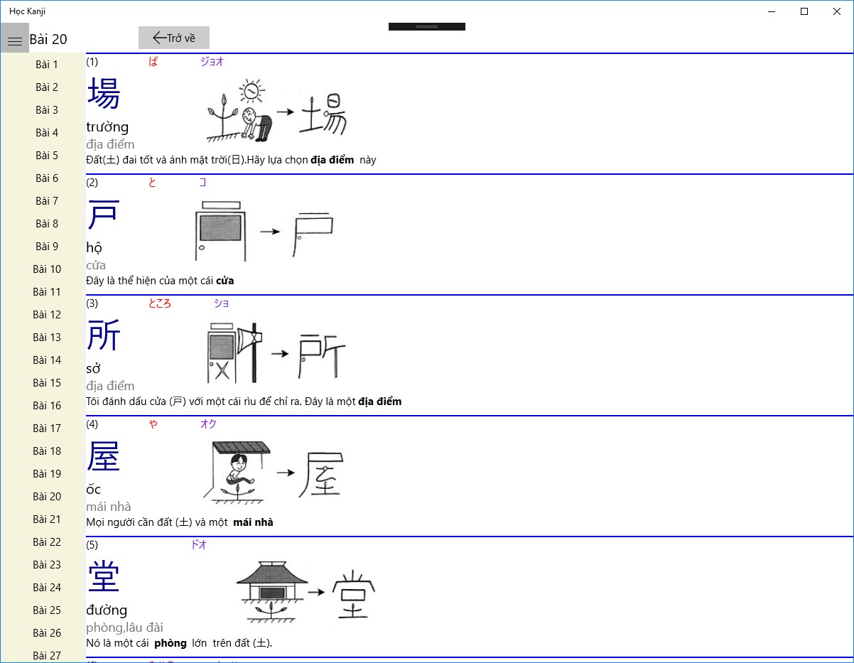 - Phần 2 học Kanji được viết theo chương trình học Kanji nhanh theo của hội thân hữu Việt Nhật. Mỗi ngày bạn sẽ cố gắng ghi nhớ mặt chữ của 40 chữ theo thứ tự từ dễ đến khó. Sau khoảng 2,5 tháng nếu chăm chỉ bạn sẽ học thuộc 2000 chữ Kanji.