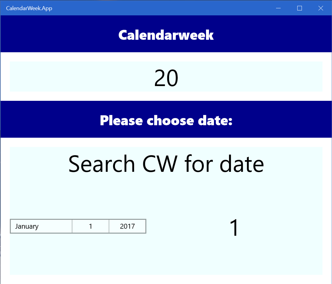 This App will show the current calendar week inside as well as within the App-Tiles. Additionally there is another possibility to choose any date you're interested.