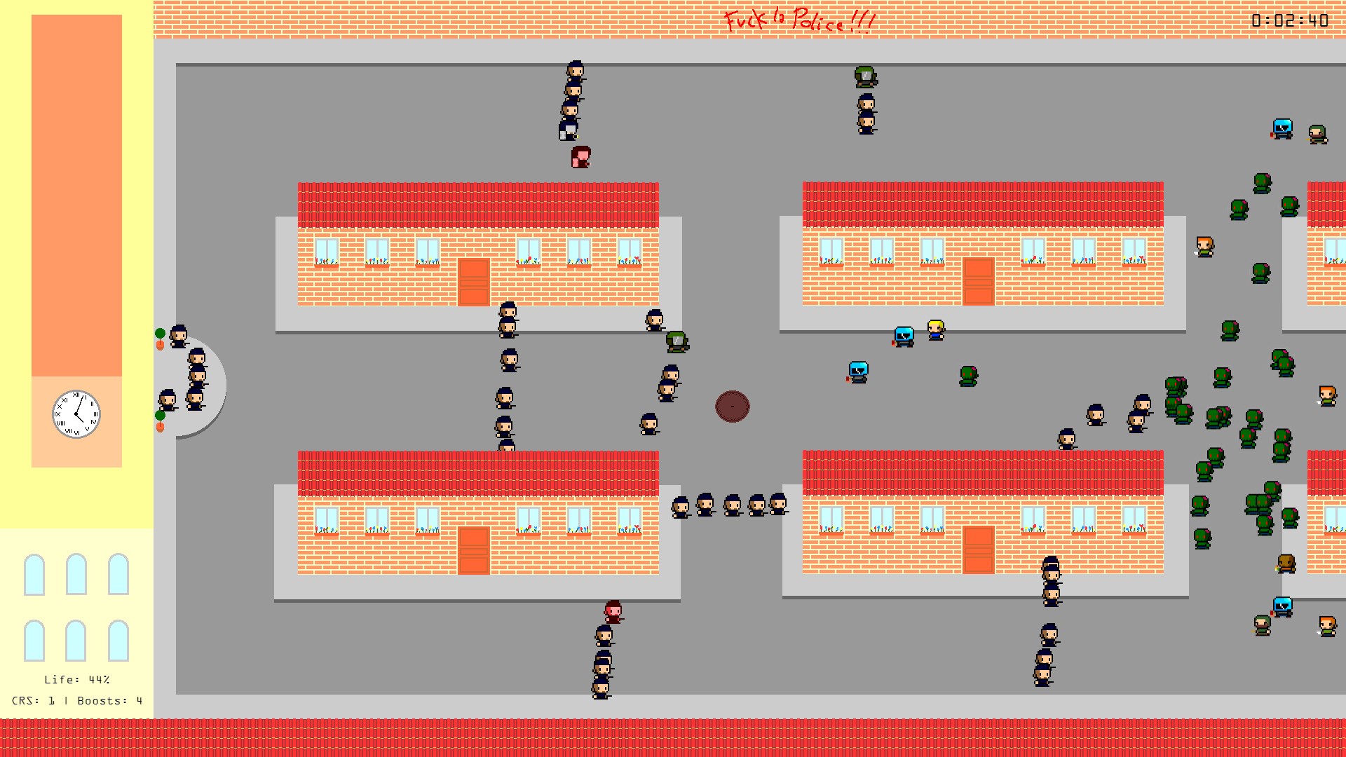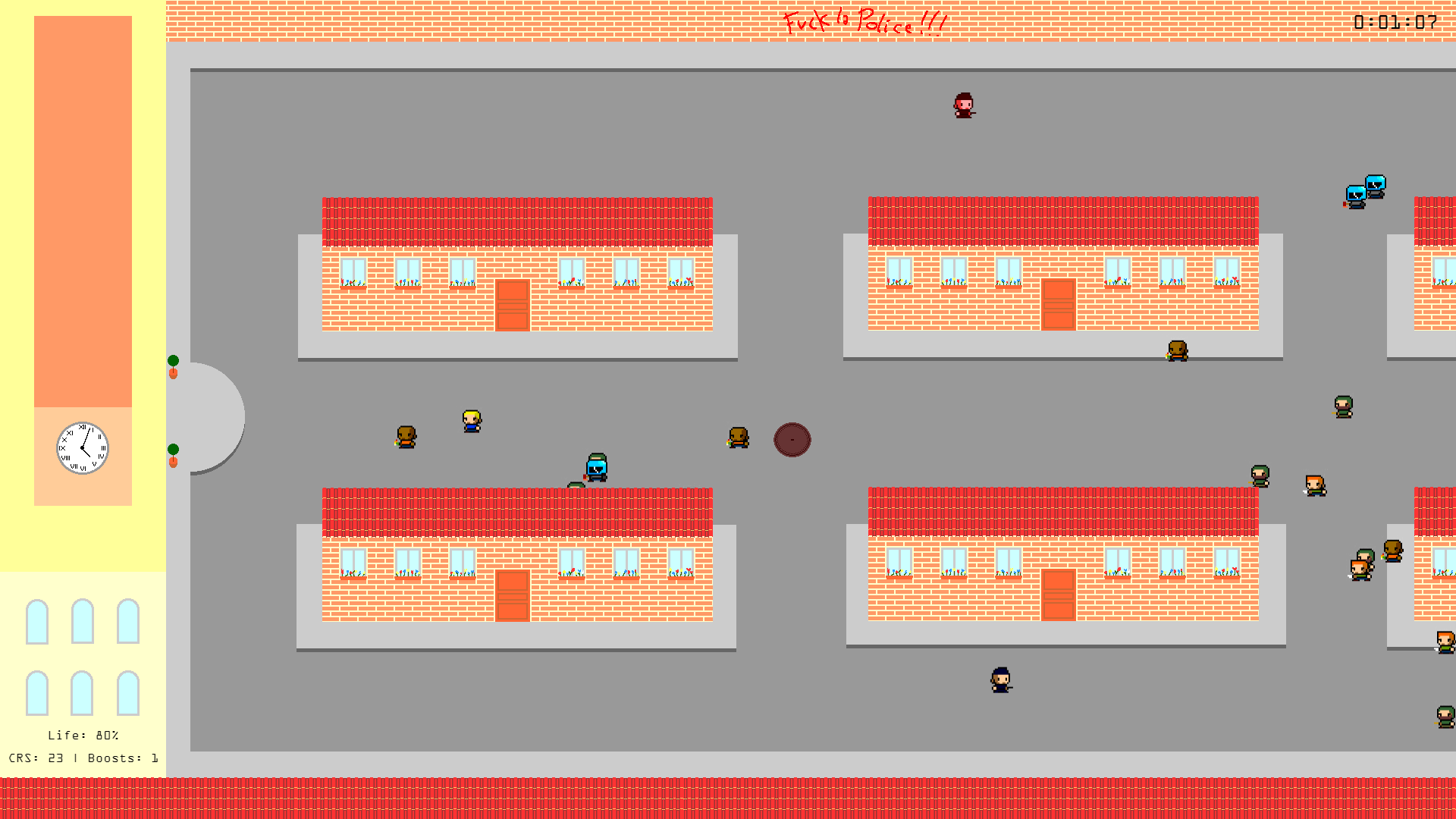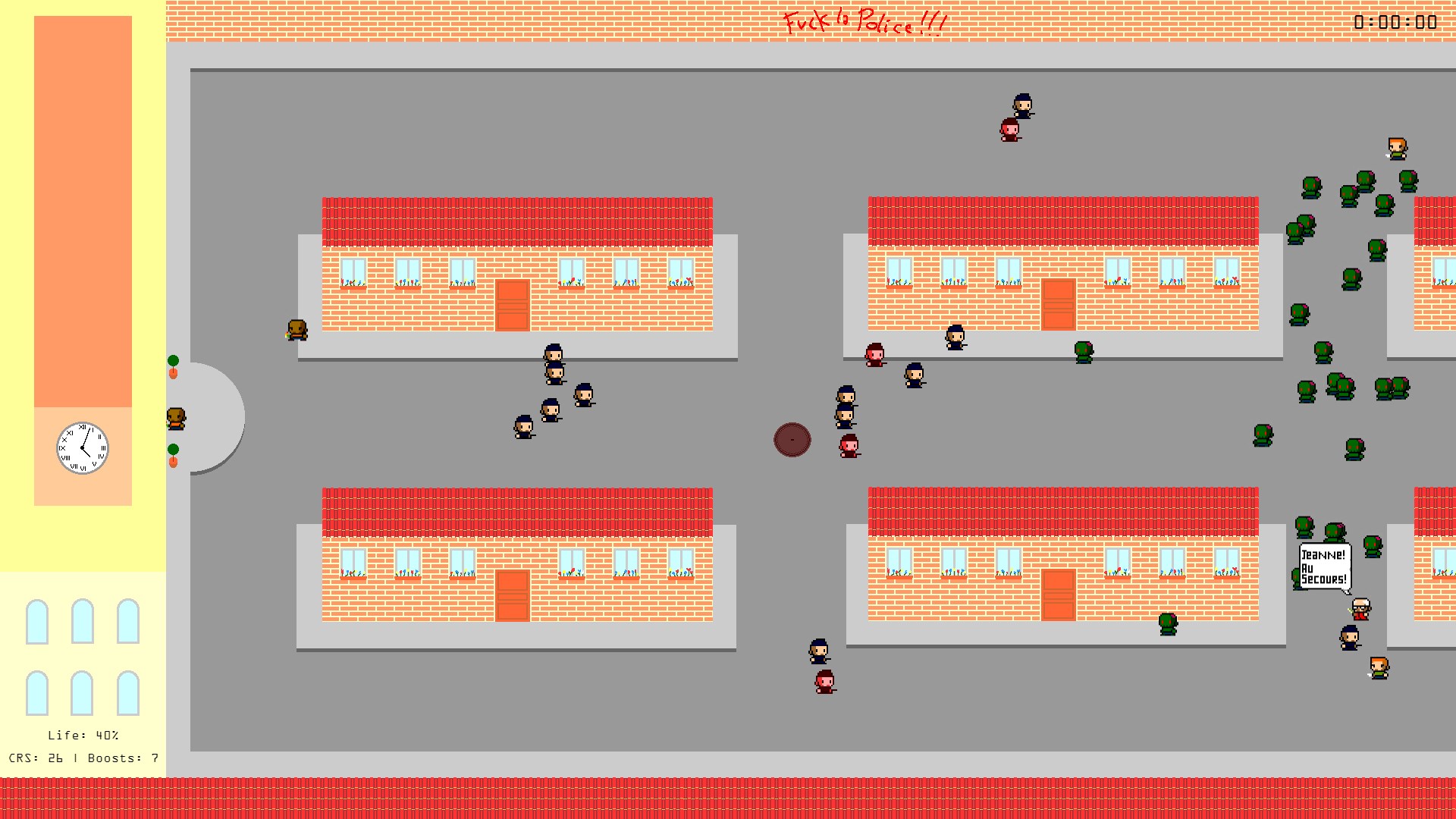 "Pixel Manif" is a game developed within 48 hours, it is a demonstration of the simulator is to manage your CRS you to avoid overflows and protect the mayor of the city as long! Beware of zombies and politicians that would sow the spoiler! #GameJam #LaGrandeConfitureDeJeux