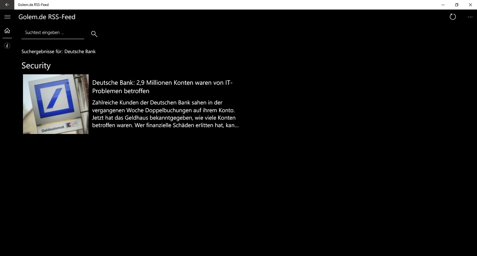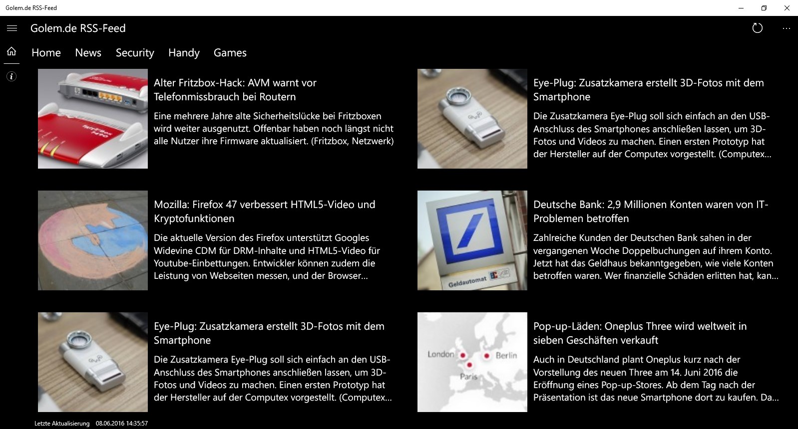 Diese App stellt den RSS-Feed von Golem.de in einer Windows 10 Universal App dar. Die Feeds sind in die Themen News, Security, Smartphone und Games unterteilt und präsentieren die Überschrift und Zusammenfassung des jeweiligen Artikels. Der Benutzer hat zudem die Möglichkeit nach bestimmten Artikeln zu suchen und den jeweiligen Artikel über den Standardbrowser zu öffnen.