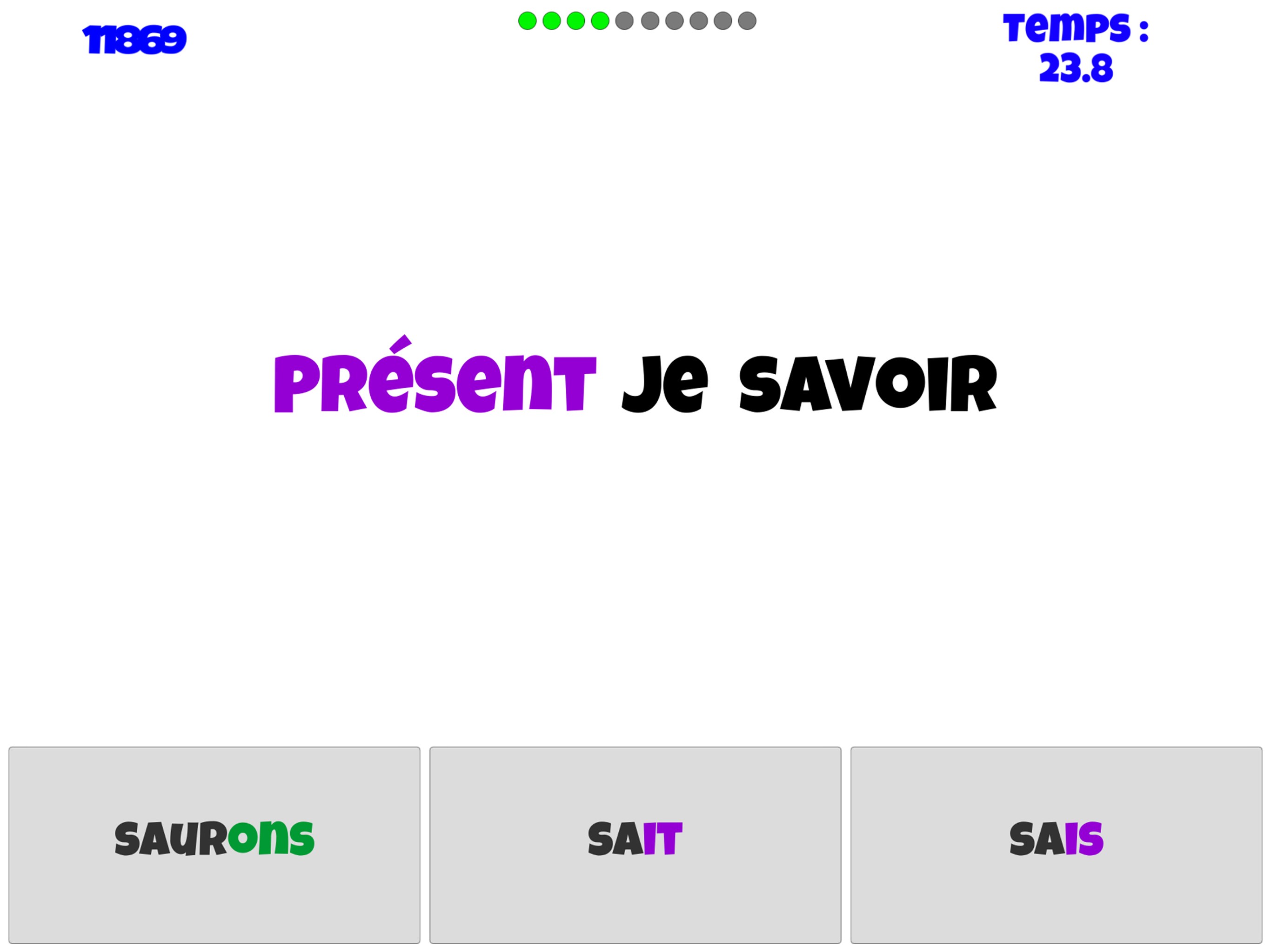 Jeu de rapidité basé sur la conjugaison française3 mini-jeux d\'apprentissageChoix des temps et groupes des verbesScore basé sur la précision et la vitesseEnregistrement des recordsDifficulté adaptative en temps réelApproprié pour les adultes et pour les enfants à partir de la fin de CE2