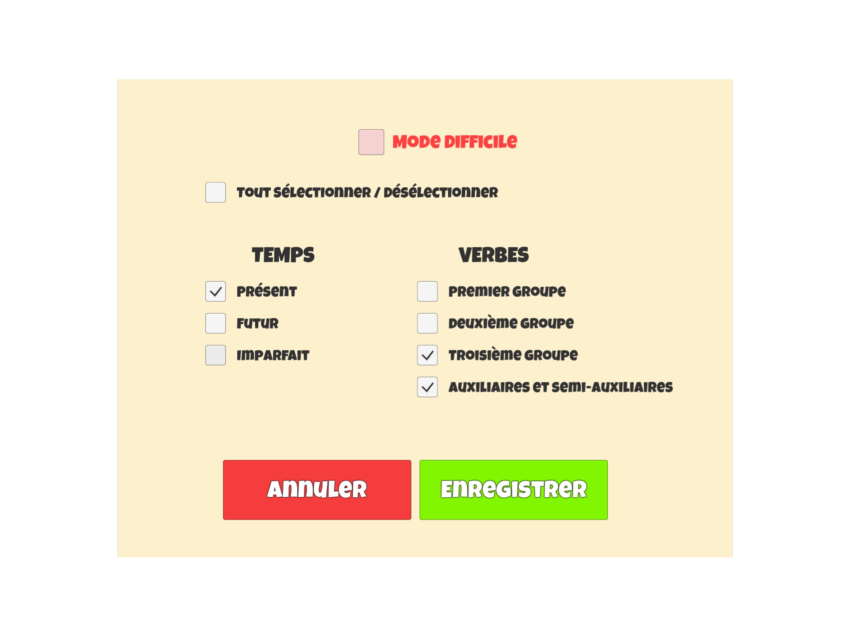 - aux élèves dès la fin du CE2 / début du CM1 (et bien sûr CM2, collège, et la suite), qui peuvent y jouer pour apprendre et réviser la conjugaison des temps que l'on emploie tous les jours : présent, futur, imparfait.