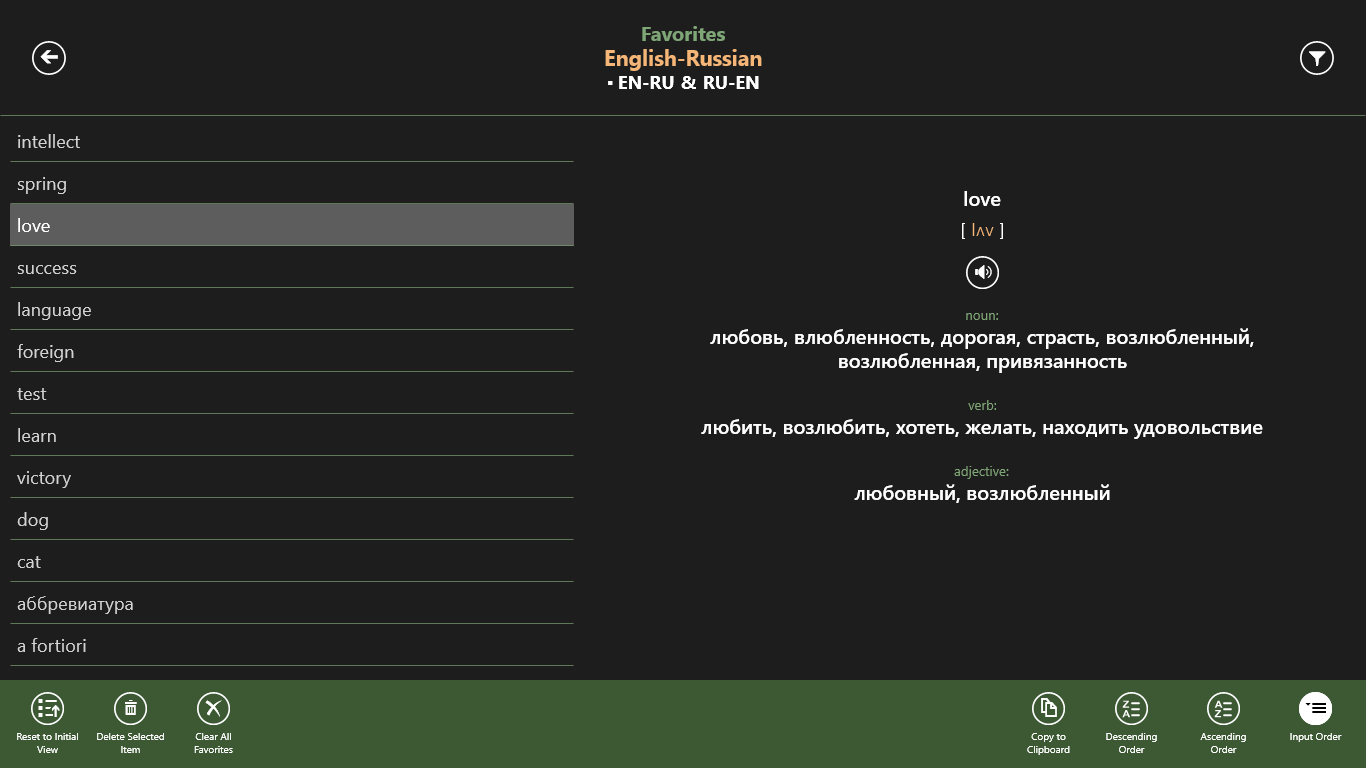 Offline dictionaries for 20 foreign languages.Fast switching between languages.Comfortable and fast search with predictive text input.Review the History of translated words, sort and group your Favorites list.Memorize words from the selected dictionary or your Favorites list by using electronic tutor.Listen to the pronunciation of words (Internet connection is required).
