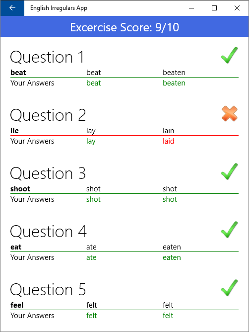 You can test your knowledge of irregulars by simple tests. Excercises are designed to focus words that you had diffuculty as you go.