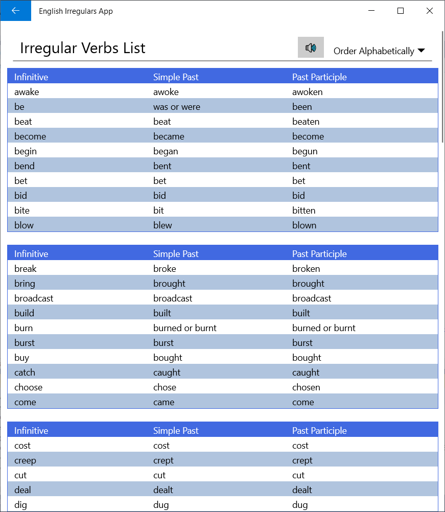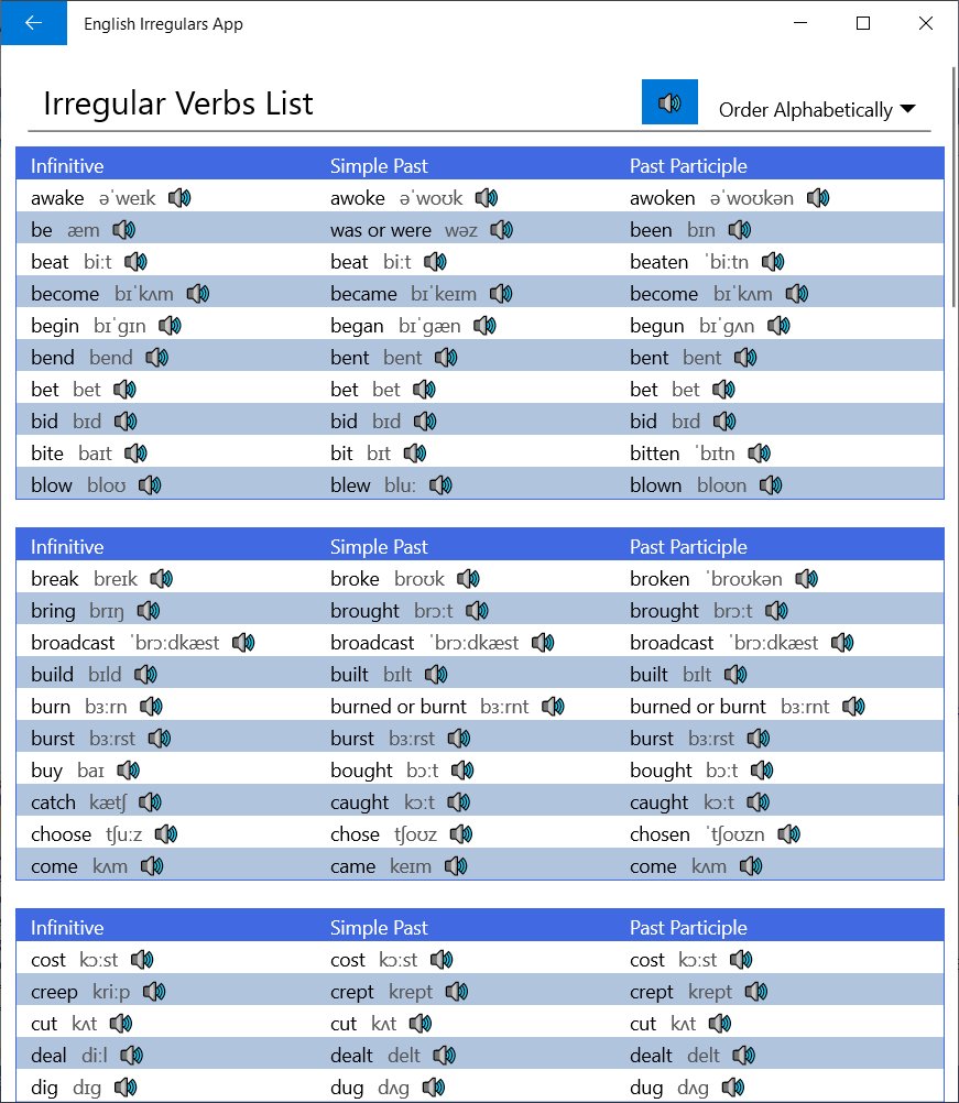 List irregular verbs or plurals by alphabetical order or by similarity of irregularityExercise irregular verbs or plurals to memorize them, try to reach %100 at proficieny percentage indicatorPin Lists to the StartHear pronunciation of irregular verbs and plurals
