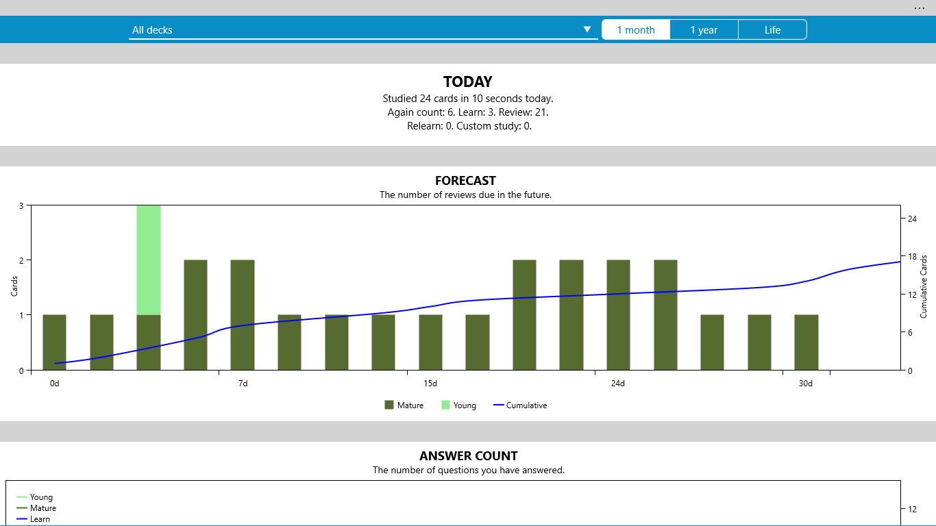 Supported contents: text, image, audio, video, hyperlink, and embedded link.Sync through OneDrive/AnkiWeb. (AnkiWeb also supports iOS, Android, Mac, and Linux.)Automatically randomize review time of cards with spaced repetition algorithm (supermemo 2) or set them by yourself.Learn outside of your nomal schedule or create sub-decks based on tags with "Custom Study".Advanced card customization features for power users.Backward compatible with Anki and AnkiDroid (which are not relating to the closed-source AnkiApp.)Whiteboard and text recognition (Ink to Text.)Text to speech.Voice recorder.Performance statistics.Various searching features: search by decks, tags, fields, card states, etc. Easily turn your decks into dictionaries when needed.Night mode.Live tiles support.Allow adding notes directly from NLP Japanese Dictionary (Website: nlpjdict.com)Open-source.
