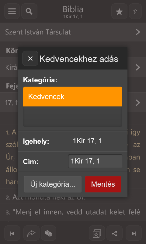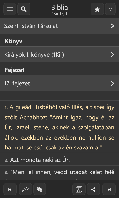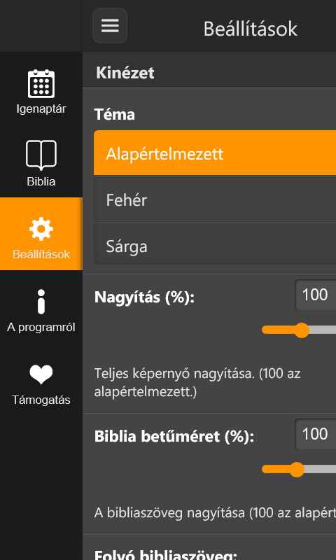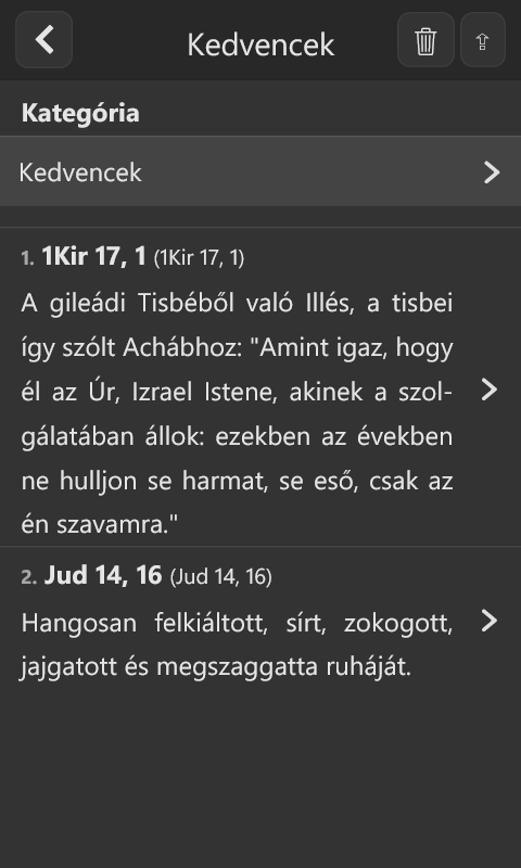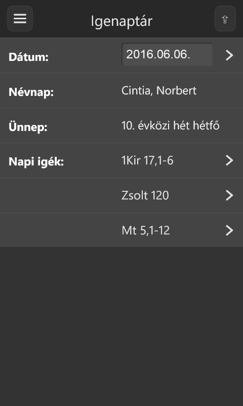 - Véletlenszerű igék: egy véletlenül kiválasztott igéhez ugrik. A beállításoknál megadható, hogy csak Ó- v. Újszövetségből adjon igéket.