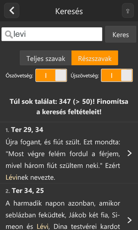 - Lehet a Biblia szövegében keresni teljes és részszavakra is és szűrhető Ó- és Újszövetségre