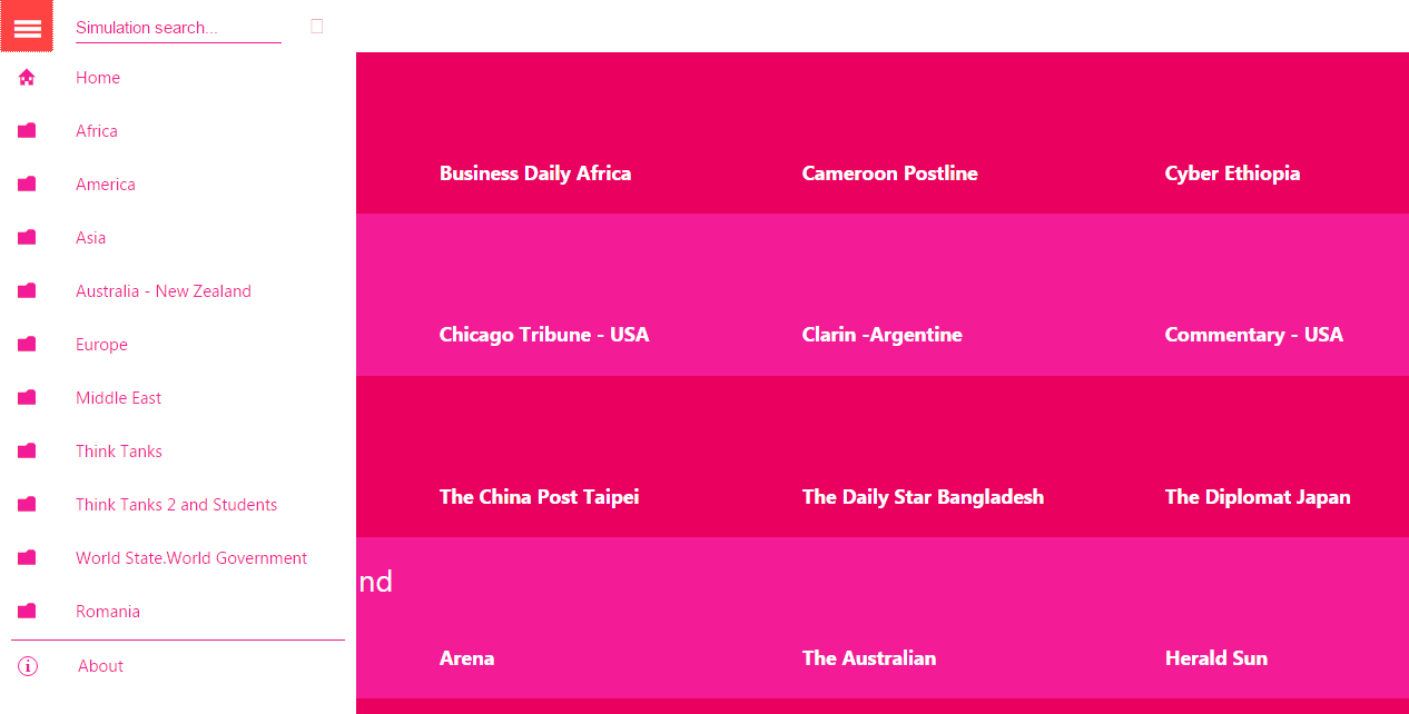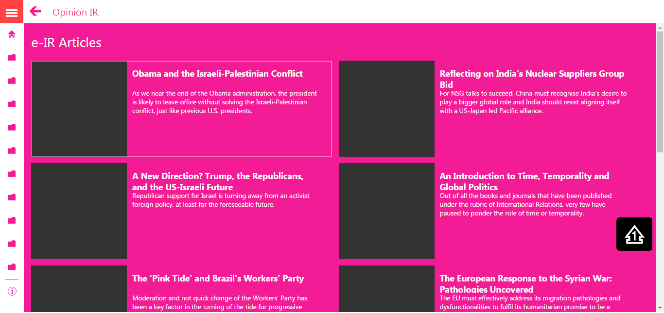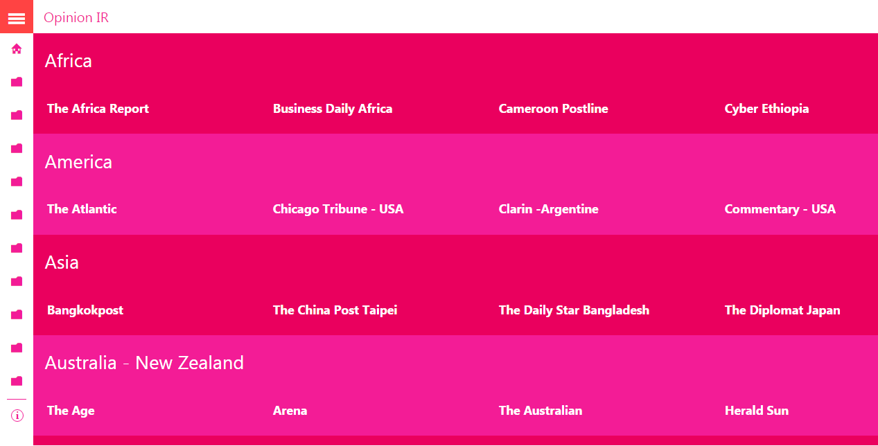 Opinion IR (Opinion International Relations) is an Rss/Feed app. It reunites the major world newspapers, magazines and think tanks. It offers a direct link to the sections: opinions, editorials, comments, articles, essays, reports, policy papers, brief policy - analysis.
