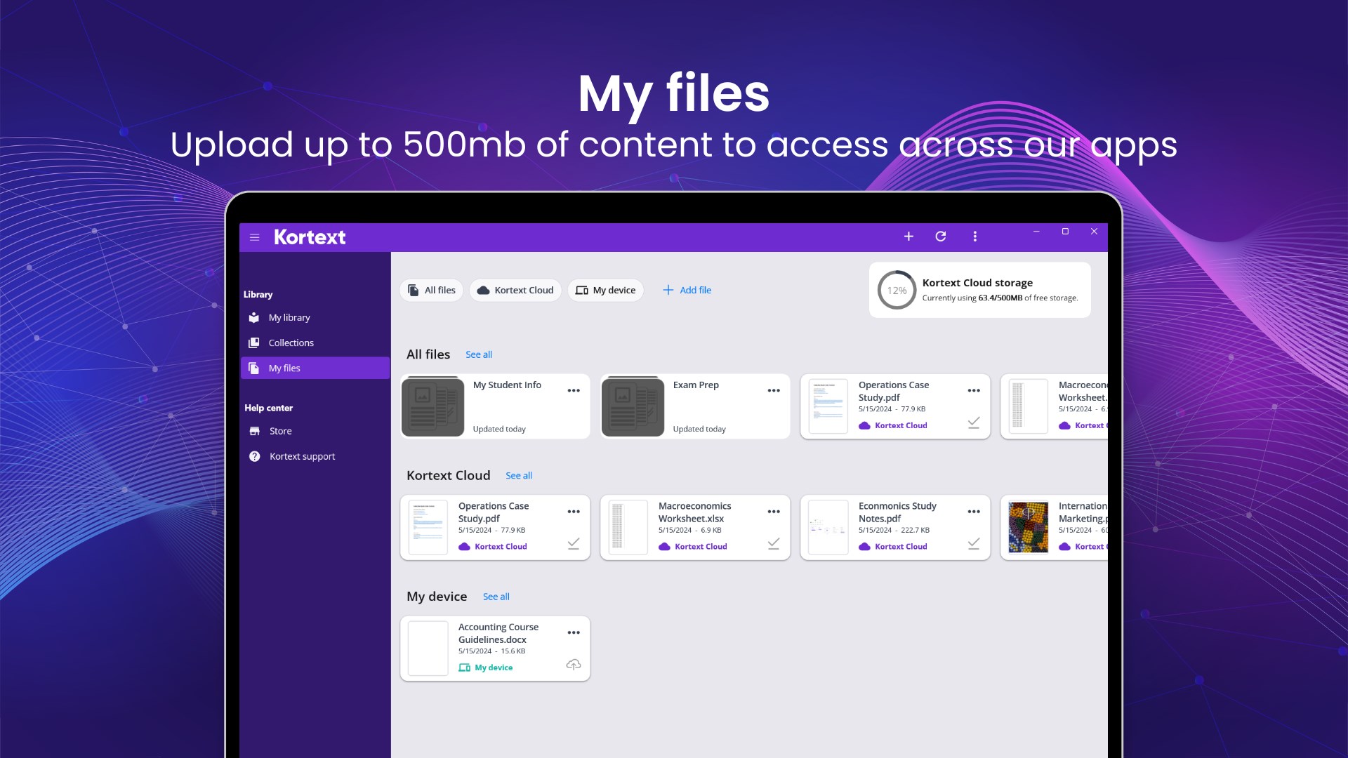 Kortext offers online and offline access to key textbooks from multiple publishers, combined with a set of tools that provide the user with functionality beyond anything traditional textbooks can offer. Enjoy unlimited access to a collection of over 13,000 eTextbooks. 500MB of free cloud file storage. Simply upload your study materials and harness the full potential within.