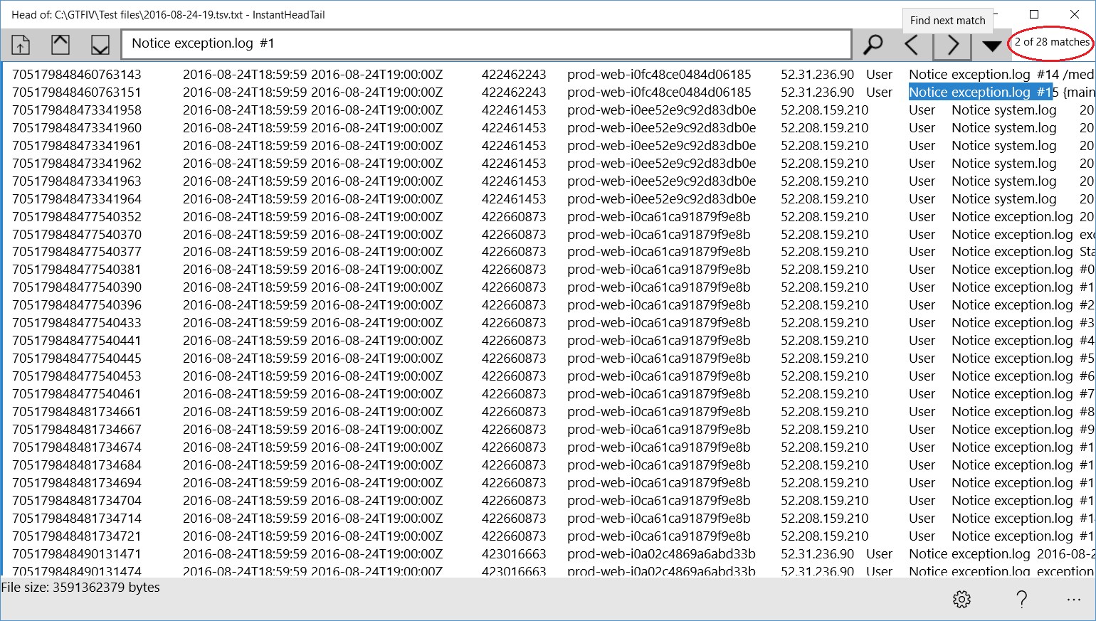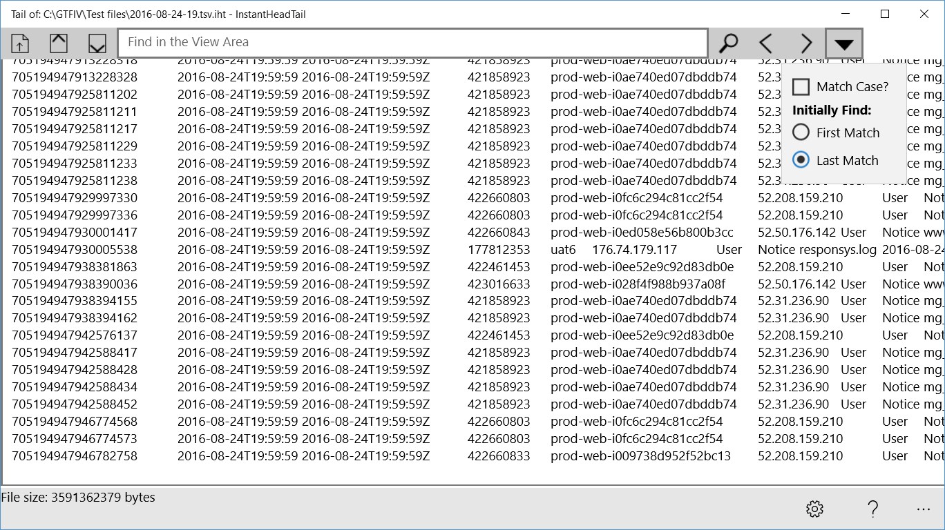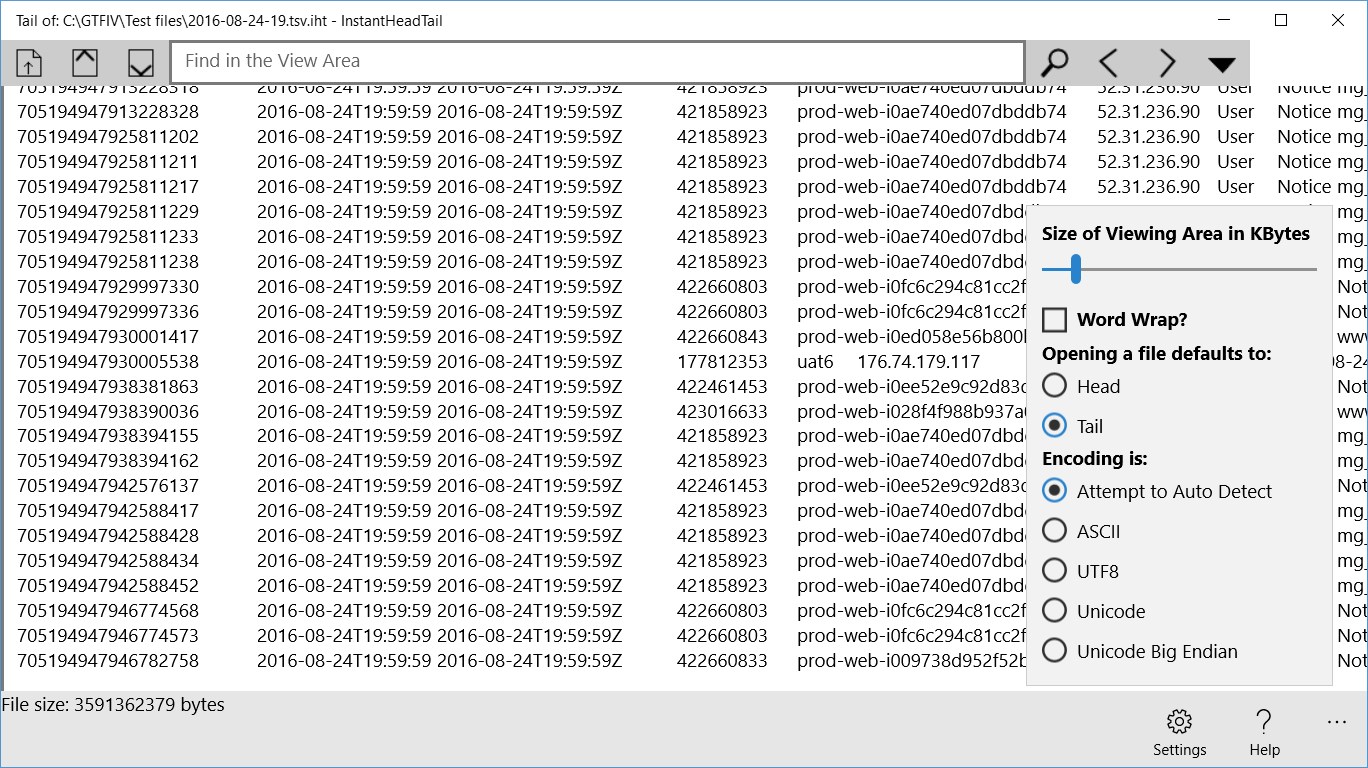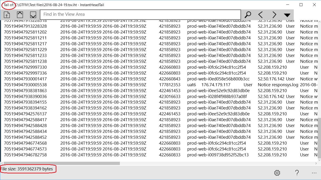 INSTANTLY read the start (head) or end (tail) of a text file of any size (multi-gigabyte).Supports various encodings (ASCII, UTF8, Unicode, Unicode BE).Display with or without Word Wrap.Find (Search) within retrieved text, search forwards or backwards, optionally match case.Associate file types (e.g. .out) with InstantHeadtail so they can be instantly opened with double-click.Configure default opening of head or tail of file.Configure number of KB retrieved in head and tail.Copes with big, large, huge, massive, gigantic, enormous, text files!