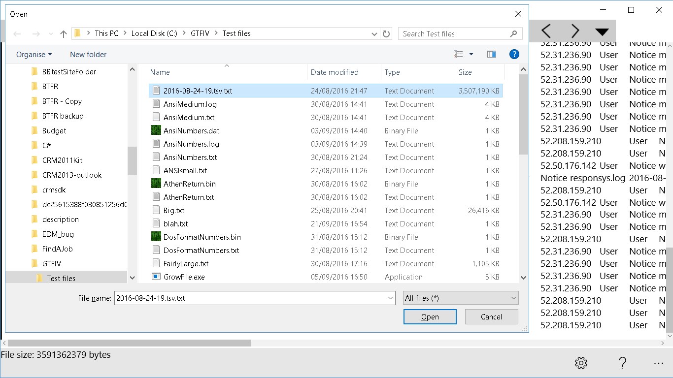 INSTANTLY read the start (head) or end (tail) of a text (ASCII, UTF8, Unicode, Unicode BE) file of any size (multi-gigabyte). Ideal for reading log/error files, it can display the end of a file as it grows allowing monitoring of new entries. This app can be associated with various text file types allowing instant opening, by double clicking etc., of the head or tail of the largest of files. The user can pre-configure how much to retrieve and whether to default to head or tail. The user can search within the retrieved data, select and copy etc.